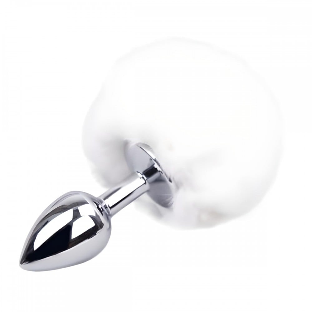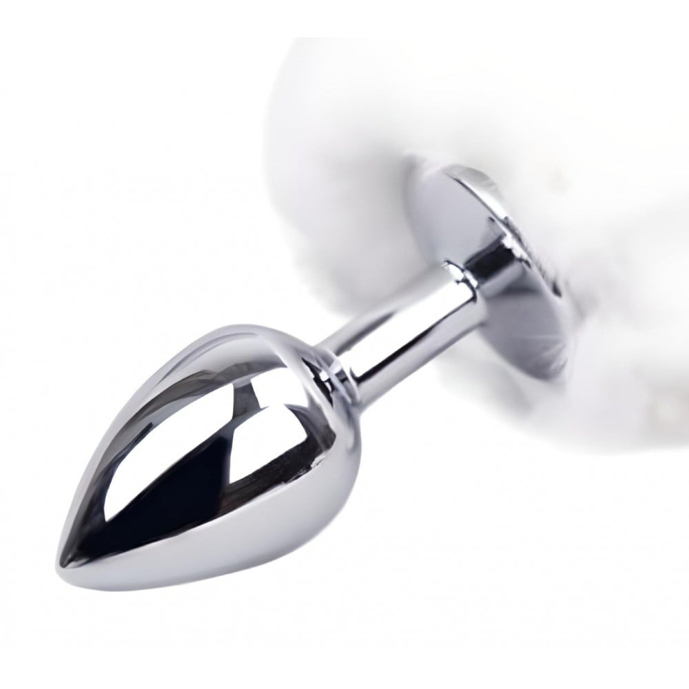 Анальний корок з білим хвостиком кролика, металевий, срібний, 7х2.8 см.