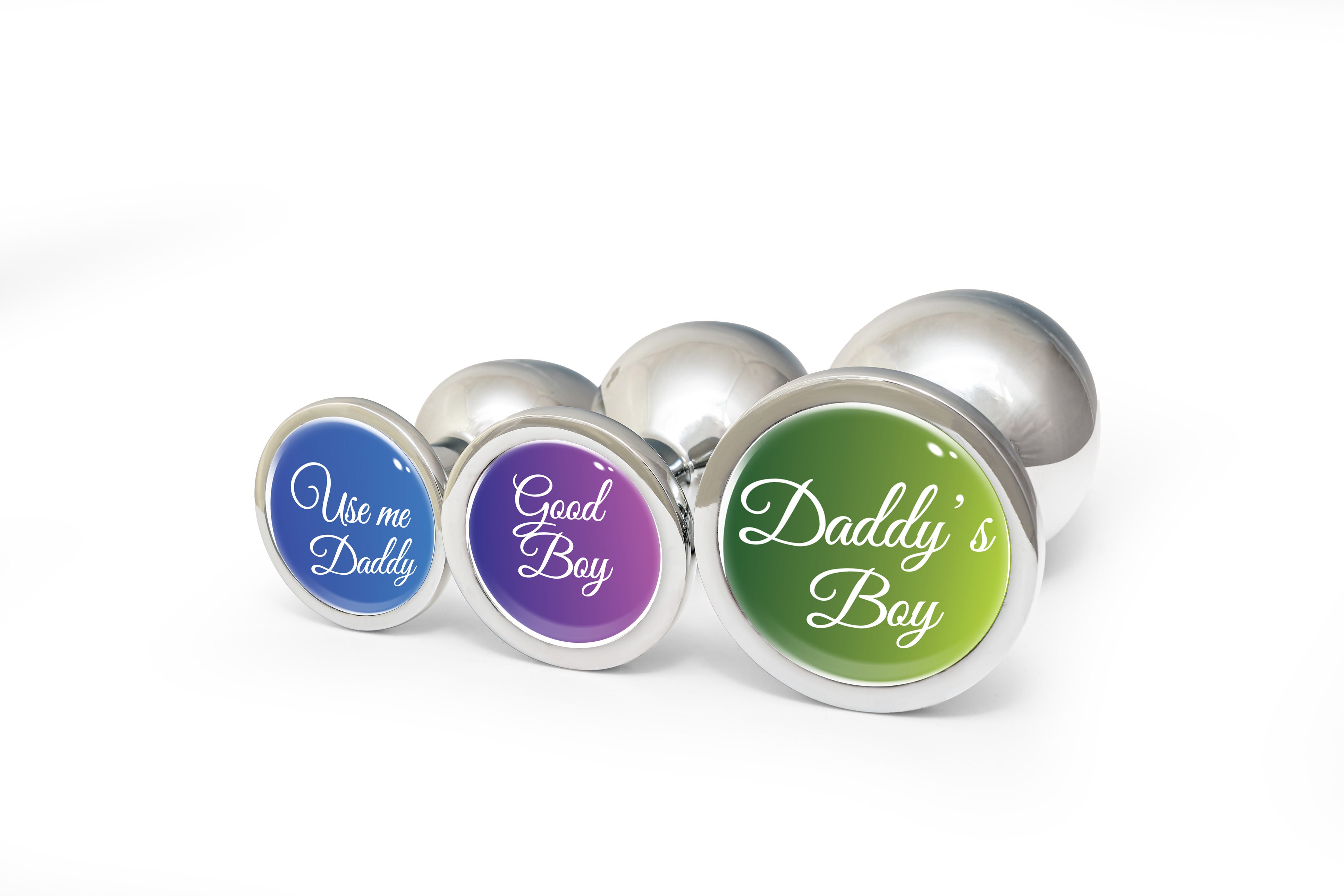 Анальна пробка металева срібляста з написом Use me Daddy OKOVA розмір S