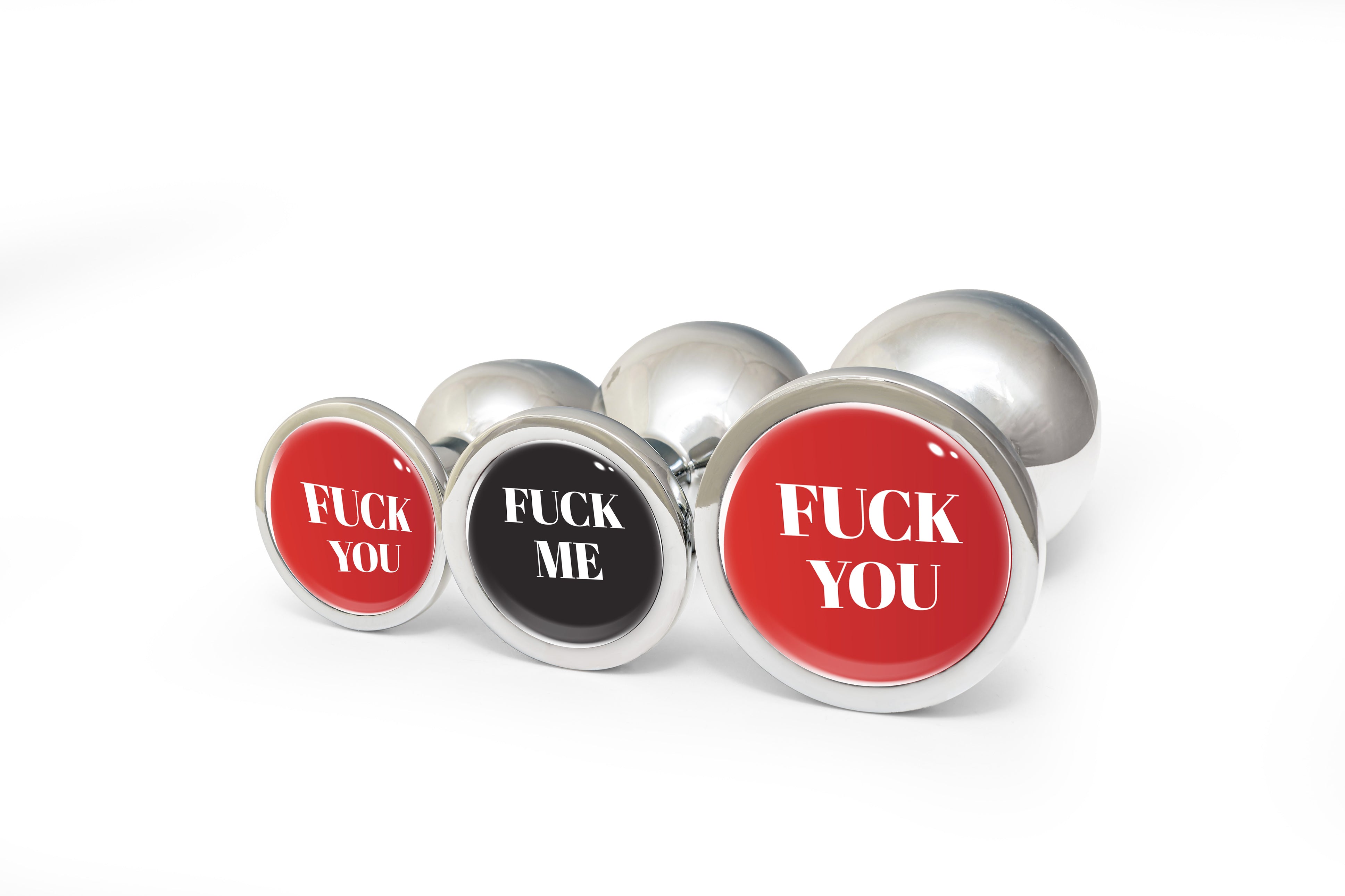 Анальна пробка металева срібляста з написом Fuck Me OKOVA розмір M