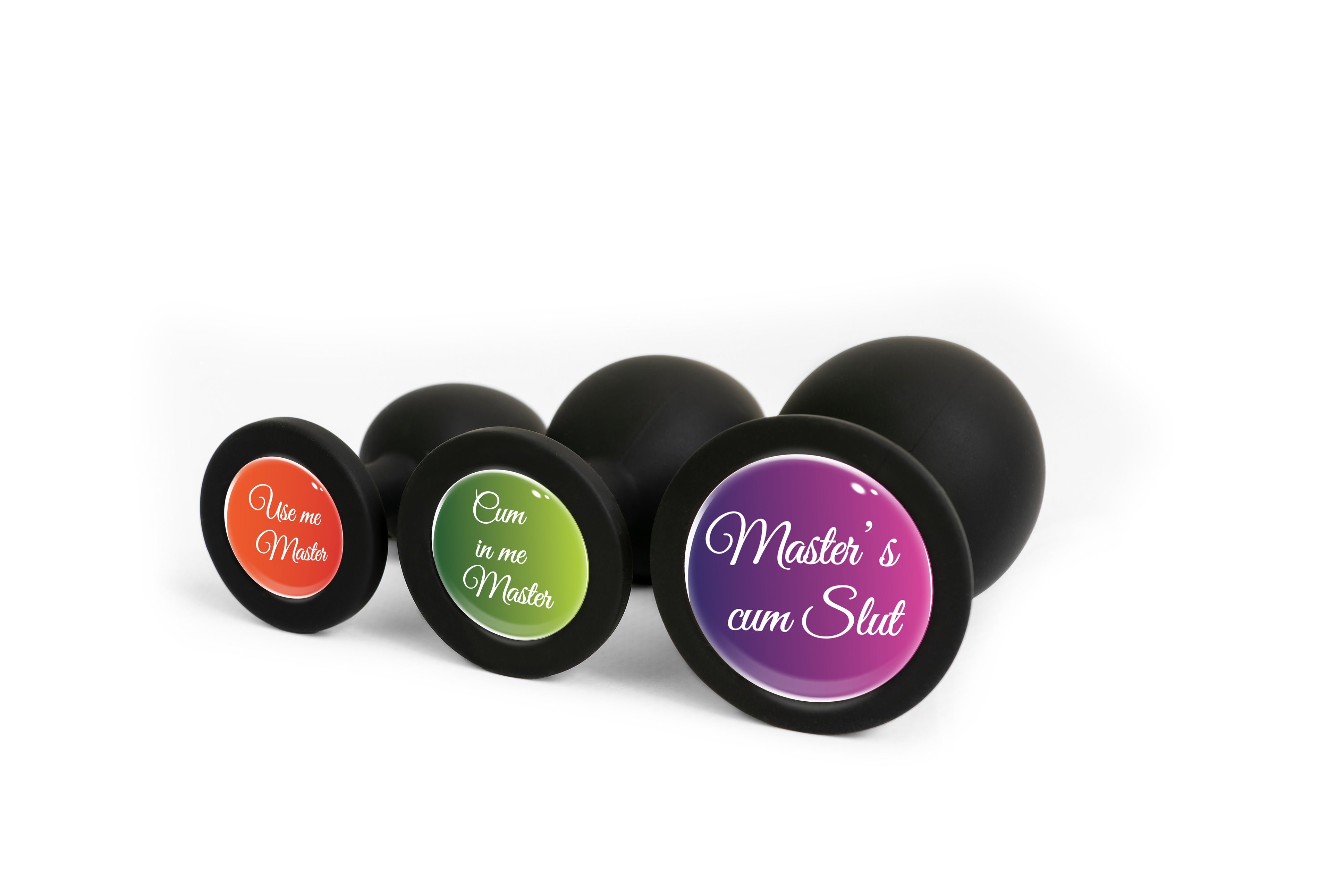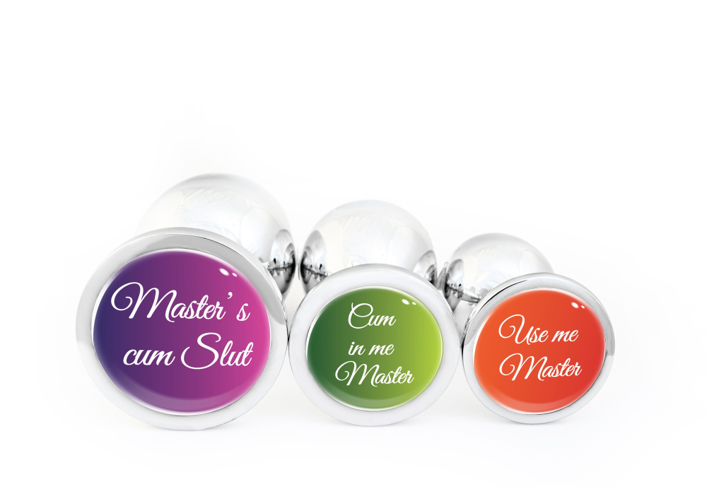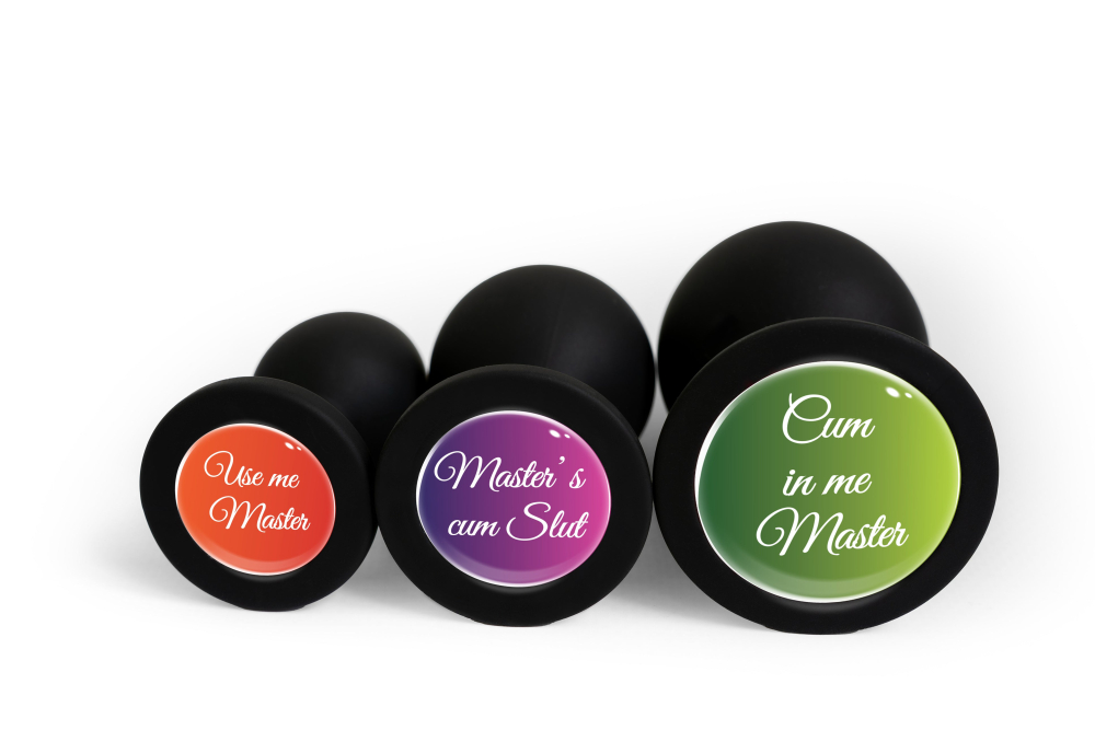 Анальна пробка силіконова чорна з написом Master's cum Slut OKOVA розмір L