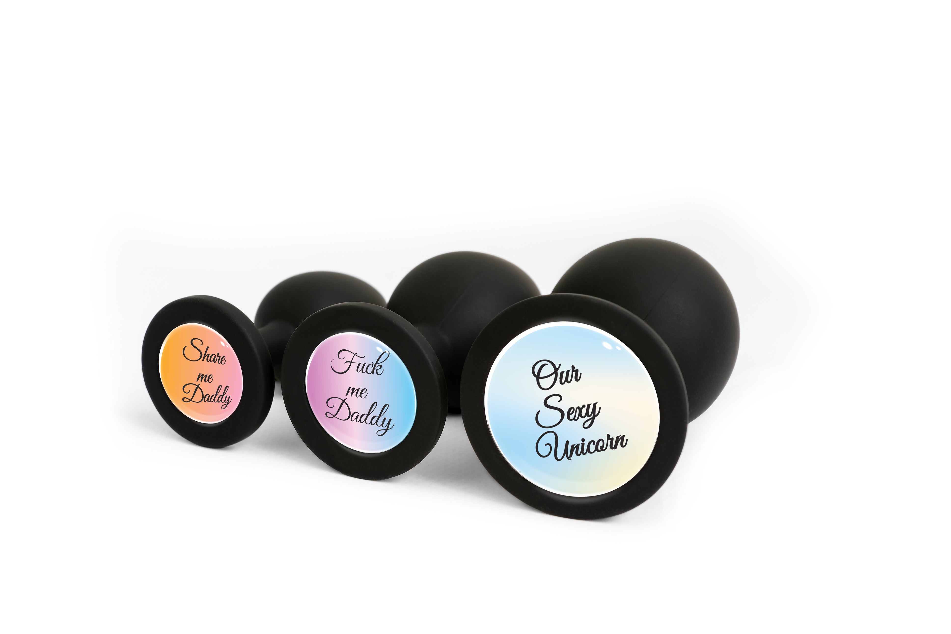 Анальна пробка силіконова чорна з написом Share me Daddy OKOVA розмір L