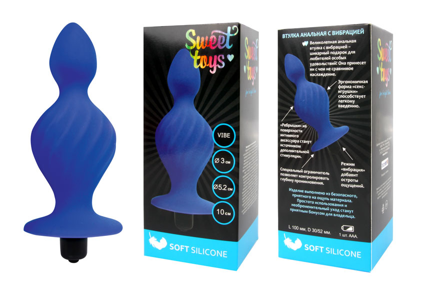 Характеристики Анальна пробка ребриста силіконова з вібрацією SWEET TOYS синя L 10 см d 3,0x5, 2 см