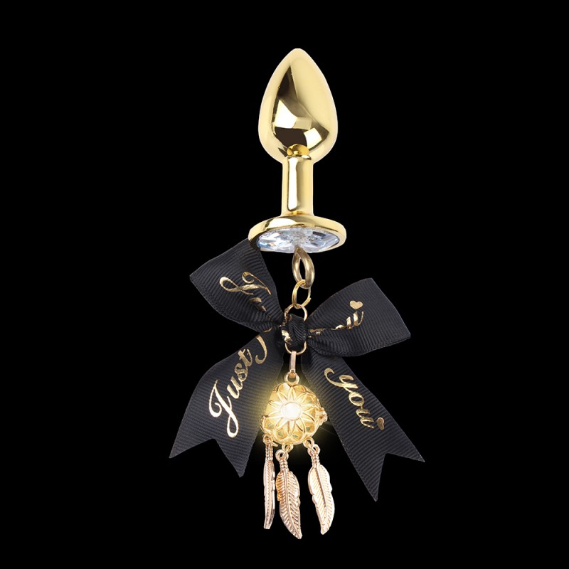 Анальна пробка із сріблястим камінчиком та затискачами для сосків з бантиками металеві золотистого кольору Chisa