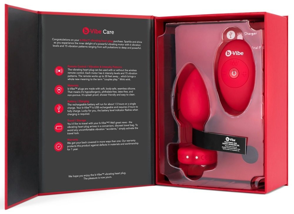 Характеристики Анальна вібропробка з камінчиком у формі серця та пультом управління червоного кольору B Vibe розміри M L