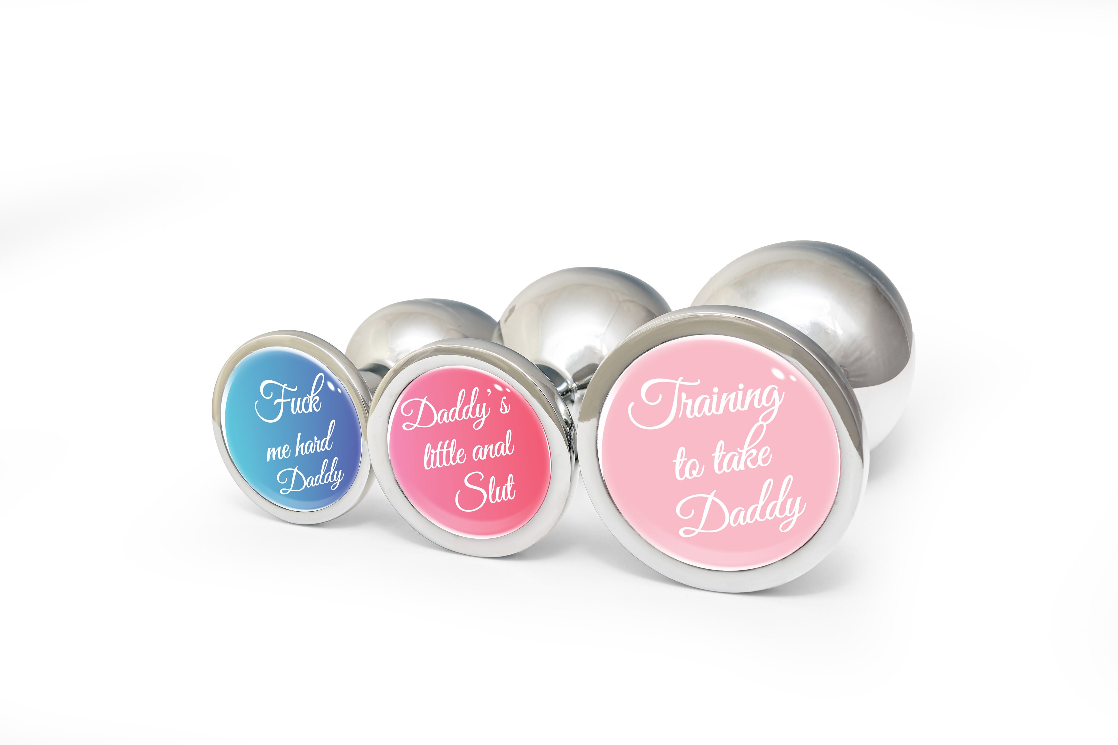 Анальна пробка металева срібляста з написом Daddy's little anal Slut OKOVA розмір M