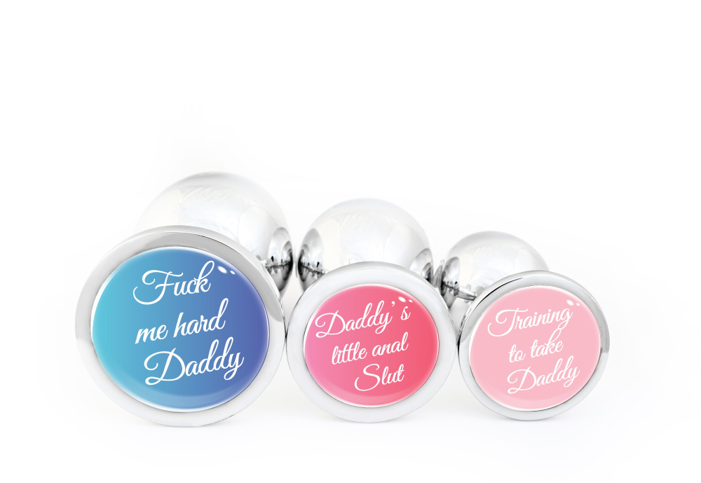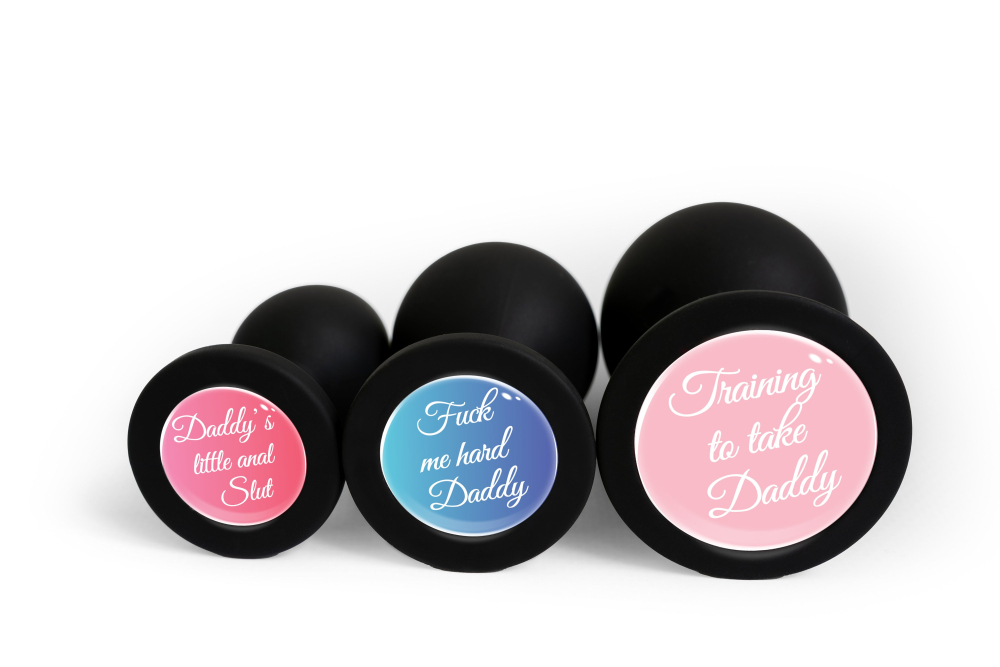 Анальна пробка силіконова чорна з написом Training to take Daddy OKOVA розмір S