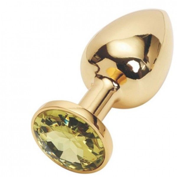 Золотиста анальна пробка з нержавіючої сталі. Прикрашена каменем (кристалом, стразами, Сваровскі). Довжина 7,6 см., Діаметр стрижня 0,7 см., Товщина в найширшому місці 2,7 см.