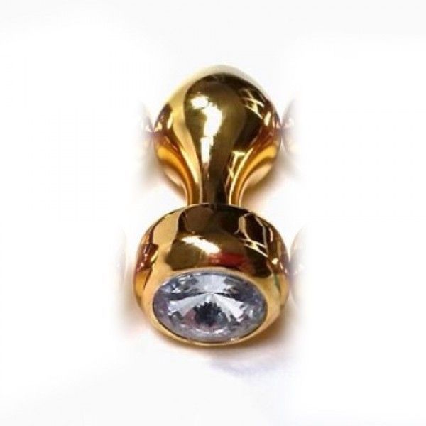 Анальна іграшка золотого кольору з білим каменем. Виготовлена з якісної медичної сталі. Довжина 7,6 см., максимальний діаметр 2,8 см., Мінімальний діаметр 1,0 см. Вага 55 грам.