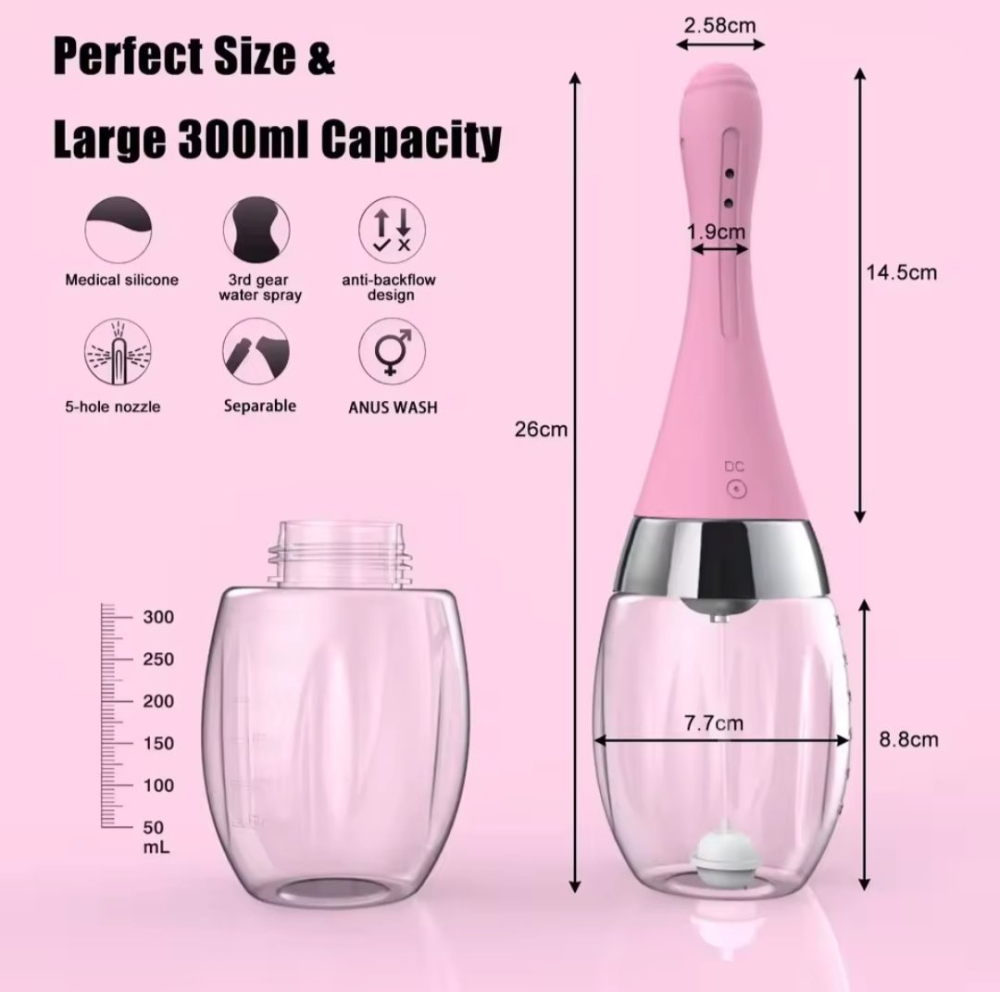 Безпечна та легка підготовка до анального сексу з комфортом та задоволенням. Автоматичний анальний душ зробить все швидко та якісно, без особливих зусиль! Анальний душ виконаний у вигляді пластикової колби для рідини із силіконовим рожевим наконечником. Наконечник гладкий і тонкий з дірками та трубкою-дозатором усередині для автоматичного відкачування рідини. Анальний душ перезаряджається через USB зарядку, яка йде в комплекті. На корпусі наконечника є одна кнопка, яка відповідає за УВІМК/ВИМК і вибір швидкості режиму подачі рідини. Використання: розкрутіть колбу і наповніть рідиною, закрутіть наконечник і затисніть кнопку на 3 секунди, щоб увімкнути, виберіть потрібну швидкість подачі, а коли закінчите- затисніть кнопку на 3 секунди для вимикання. Перед та після використання обробляйте спеціальним спреєм для інтимних виробів та промивайте теплою водою. Матеріал: силікон, пластик Об'єм: 300 мл Швидкість: 3 режими подачі Колір: рожевий, прозорий Загальна довжина: 260 мм Довжина колби: 88 мм Довжина наконечника: 145 мм Діаметр: 25 мм, 15 мм Зарядка: USB в комплекті Упаковка: коробка