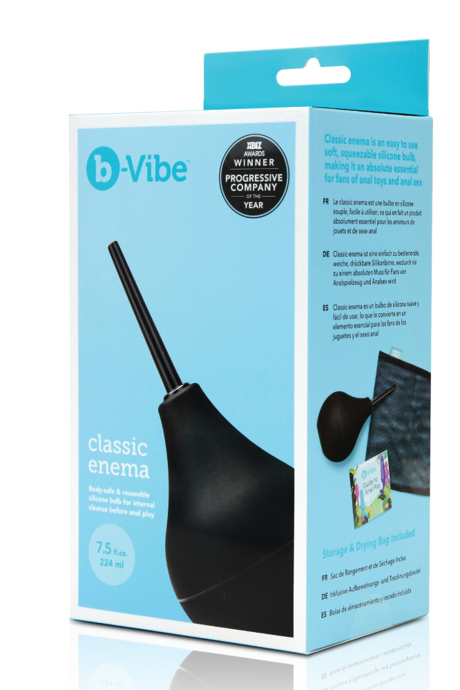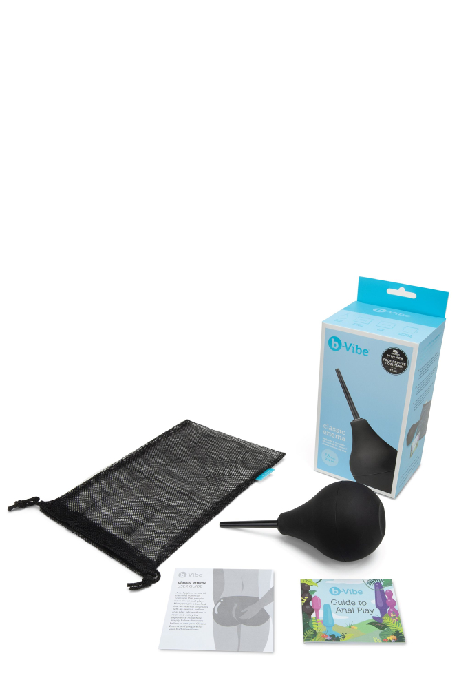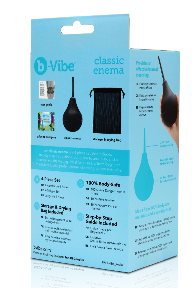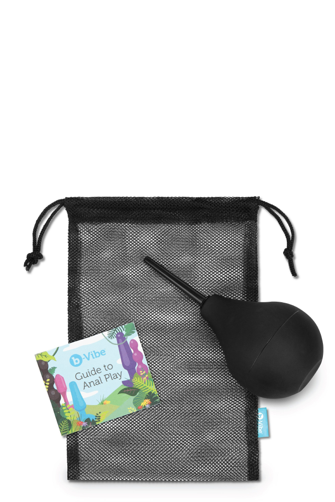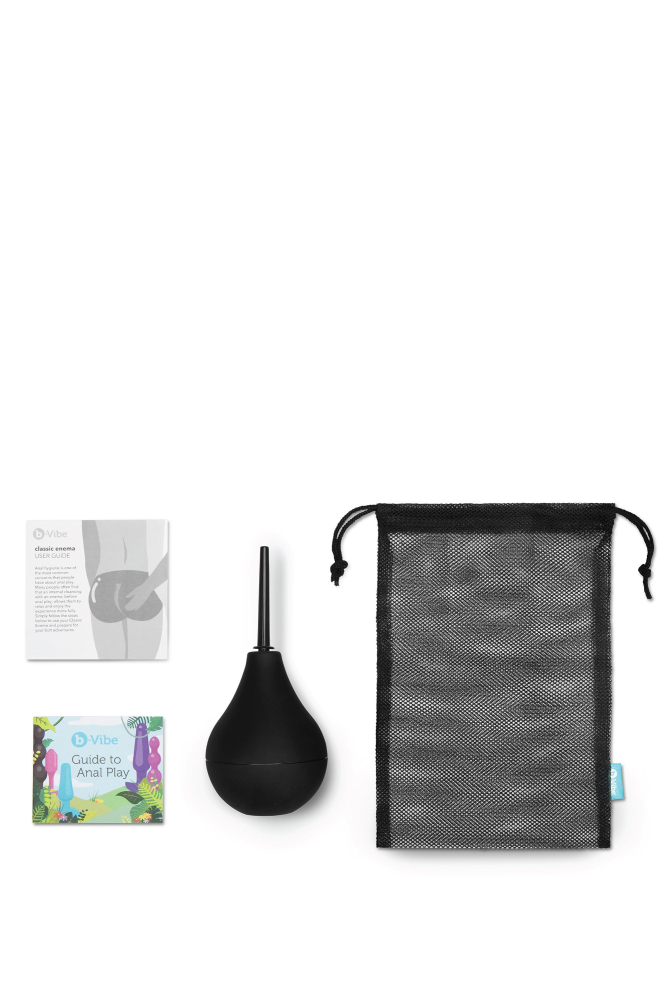 Класична клізма b-Vibe являє собою набір із чотирьох предметів, що включає покрокові інструкції, посібник з анальних ігор, а також сумку для зберігання та сушіння.