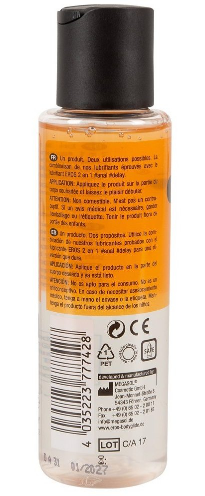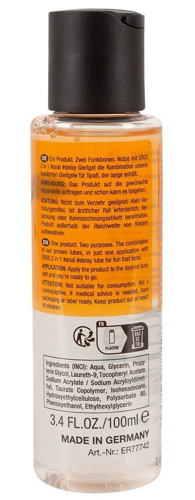 Знеболюючий анальний гель-лубрикант Eros 2in1 #anal #delay - ідеальне мастило для анального задоволення! Мастило Eros #anal #delay призначене для зменшення дискомфорту під час анального сексу, забезпечуючи м'який ефект оніміння. Мастило на водній основі, нелипке і нежирне, тому ви можете насолоджуватися безперервним задоволенням так довго, як забажаєте. Це універсальне мастило безпечне для використання з усіма типами секс-іграшок, включаючи силікон, латекс та скло. Її ніжна формула гіпоалергенна і не містить шкідливих хімікатів, що робить його придатним навіть для найчутливішої шкіри. Підходить для використання із латексними презервативами. Без запаху та смаку.