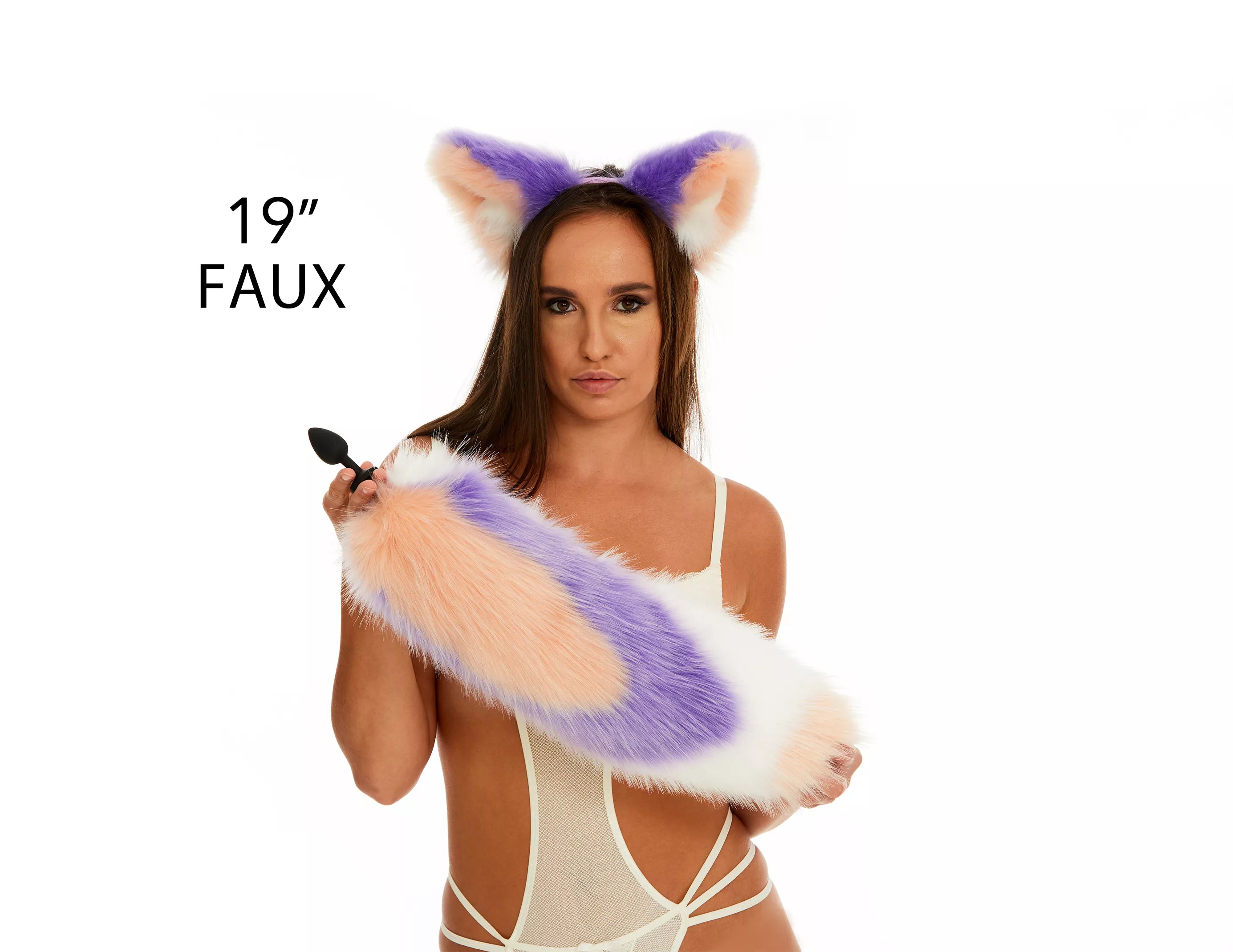 Анальний хутряний хвіст без пробки Триколірний Персиковий фіолетовий білий з персиковим кінчиком OKOVA 500 мм