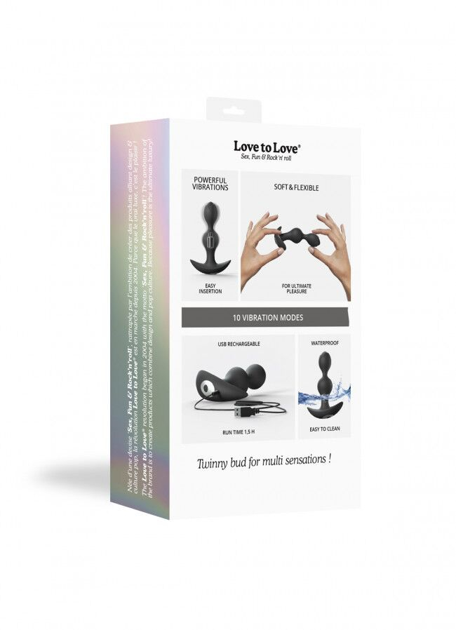 М'якість і гнучкість — ось головні характеристики цієї чудової іграшки. Анальний стимулятор, гнучкий з вібрацією Love To Love TWINNY BUD підійде і для першого досвіду анальних ігор, і для більш просунутих розваг. Справа в тому, що вводити можна як тільки верхній кульку, менший за діаметром, так і обидва відразу.