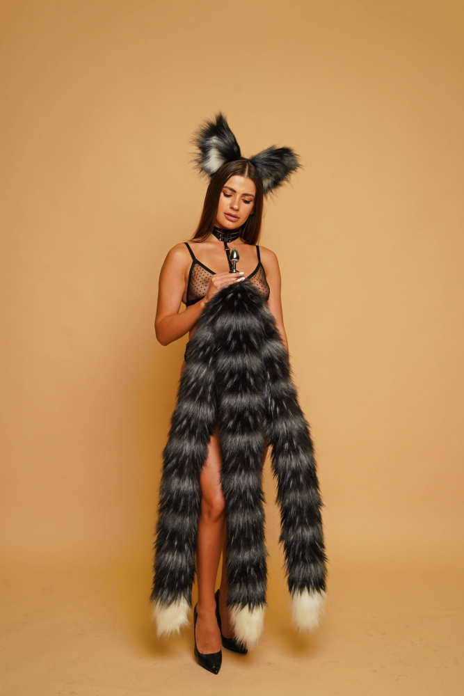 Анальний потрійний хутряний хвіст без пробки Чорнобурка з білим кінчиком OKOVA 1000 мм