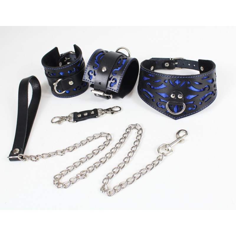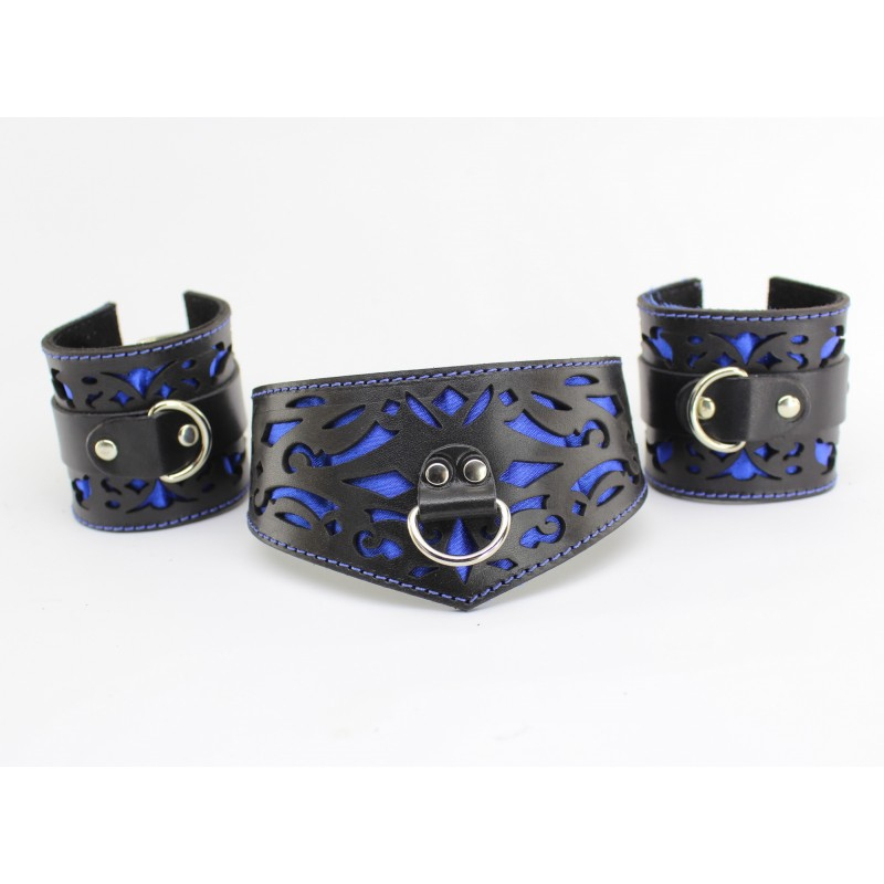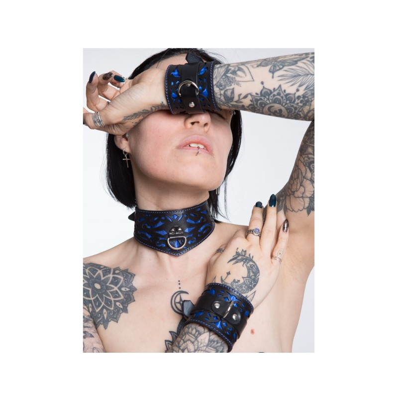 Ажурна система фіксації з синіми візерунками БДСМ для шиї та рук та ніг з натуральної шкіри чорного кольору Scappa