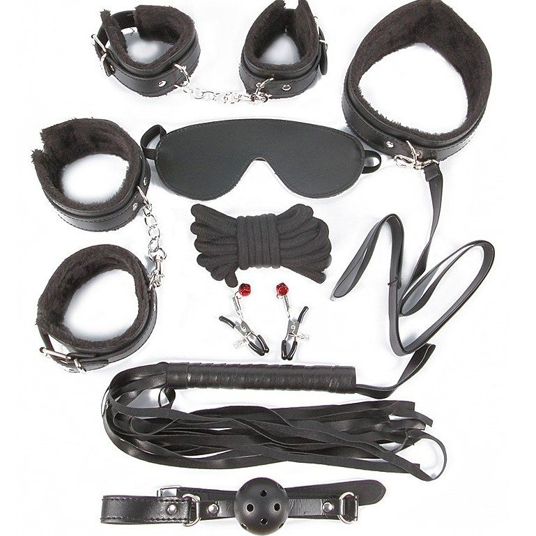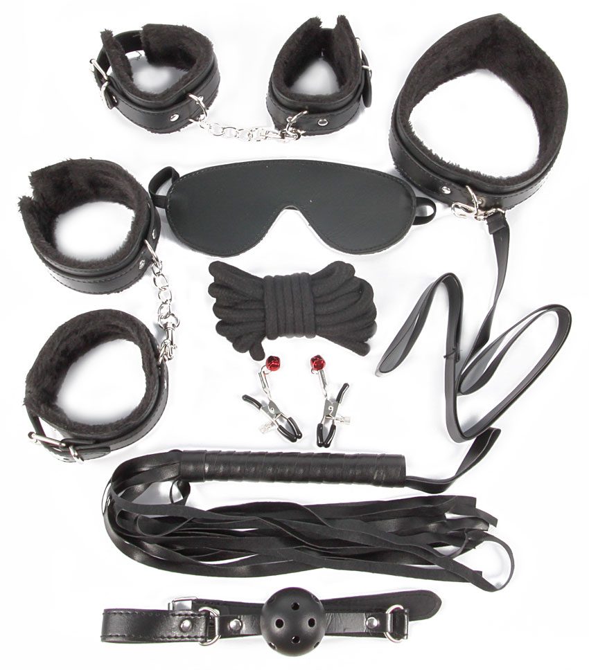 КОМПЛЕКТ (наручники, кайдани, маска, кляп, батіг, нашийник з повідцем, мотузка, затискачі для сосків) Колір Чорний, PVC, текстиль арт. NTB-80330