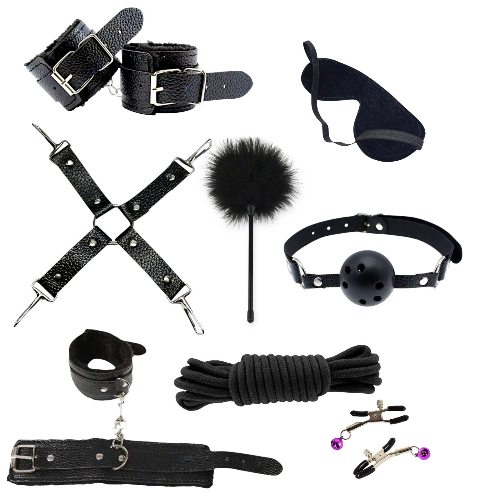 Зв'язати мотузкою або знерухомити тіло кайданами - вирішуйте самі. Набір БДСМ «Loving submission» у чорному кольорі, зібрав у собі основні деталі для пікантного проведення часу. Пориньте у світ пристрасті та підпорядкування без роздумів! Фантазуйте з пестощами, грайте міняючись ролями, використовуйте затискачі на соски і ніжні дотики лоскоту - нехай ваш вечір наповниться новими гарячими відчуттями. БДСМ набір «Loving submission» у чорному кольорі виглядає сексуально та брутально одночасно. М'яка екошкіра та плюшеві деталі збуджують і дають волю фантазії. Наручники та кайдани на ноги зроблені з чорної екошкіри з металевими застібками, на внутрішній частині м'який, чорний плюш. Конектор чорний, що з'єднує наручники та кайдани виконаний з еко шкіри з металевими прищіпками. Щільно кріпиться та надійно знерухомлює. Маска колір чорний – еко шкіра, всередині м'яка замша. Кляп колір чорний – пластикова кулька з дірочками для вільного доступу повітря, ремінець зроблений з еко шкіри з металевою застібкою. Лоскітка-пластикова чорна ручка з чорним пір'ям на кінці. Мотузка чорна 3 метри – м'яка та приємна, не натирає шкіру, не завдає дискомфорту навіть при сильному зв'язуванні. Затискачі на соски - металеві з фіолетовими дзвіночками. Матеріал: еко шкіра, плюш, метал Колір: чорний