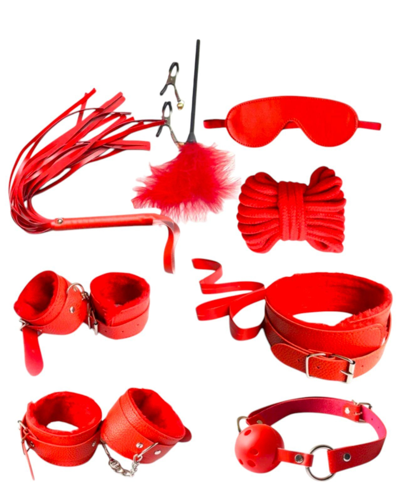 Палаюча пристрасть і шалене бажання підкоряти або підкорятися - ось що рухає справжніми поціновувачами БДСМ. У наборі є все необхідне для фіксації, зв'язування та покарань – за вами лише придумати СТОП слово. Набір чудово підійде для початківців у світі БДСМ, тому що його матеріал досить м'який і не доставить дискомфорту та особливих больових відчуттів, але при цьому розкриє вашу фантазію та розбудить усі ерогенні зони! Наручники та кайдани на ноги зроблені з червоної екошкіри з металевими застібками, на внутрішній частині м'який плюш. Червоний хрестоподібний конектор, що з'єднує наручники та кайдани, виконаний з еко шкіри з металевими прищіпками. Маска колір червоний - екошкіра, на гумці, всередині м'який замш. Кляп колір червоний - пластикова кулька з дірочками для вільного доступу повітря, ремінець зроблений з еко шкіри з металевою застібкою. Лоскітка -пластикова чорна ручка з червоним пухом на кінці. Мотузка червона 3 метри – м'яка та приємна, не натирає шкіру, не завдає дискомфорту навіть при сильному зв'язуванні. Затискачі на соски - металеві з фіолетовими дзвіночками. Нашийник з повідцем-м'яка екошкіра з пухнастим плюшем усередині, регулюється металевою застібкою. Плеті-червоний шкірозамінник, м'яка і зручна. Довжина рукояті-26см, довжина хвоста-32 см Матеріал: еко шкіра, плюш, метал Колір: червоний