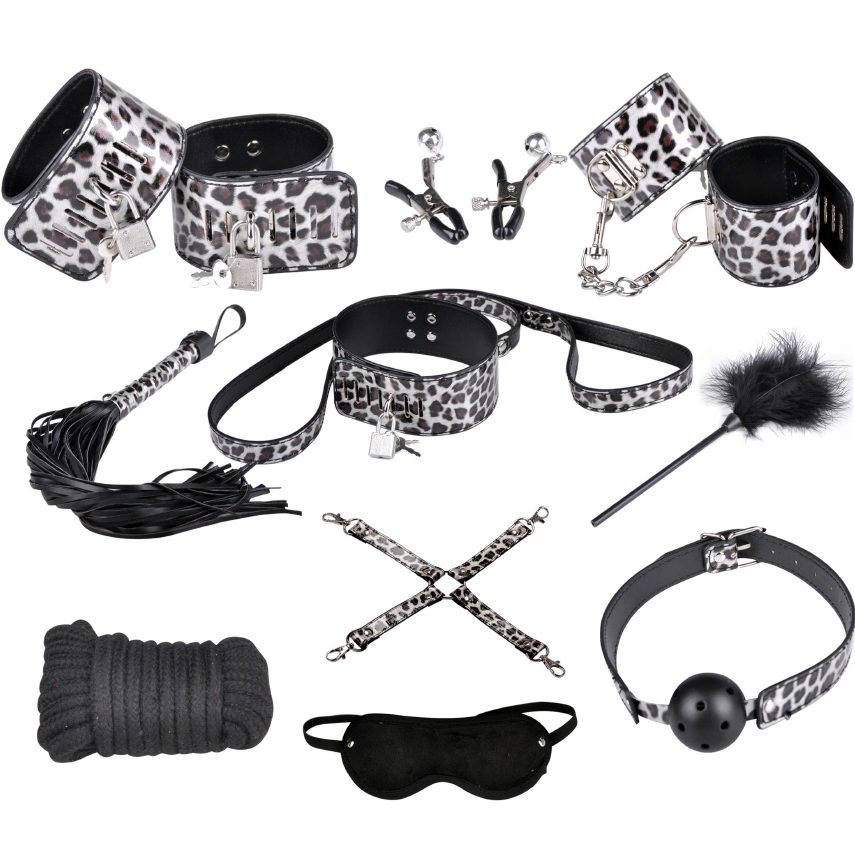 Набір розкішних аксесуарів у біло-леопардовому забарвленні скрасить інтимний вечір та подарує бурю емоцій. Він дозволить втілити в життя найнепристойніші мрії та обіграти різні сценарії з елементами домінування та підпорядкування. До комплекту входить 10 виробів різного призначення. Вони виконані з високоякісних матеріалів та оздоблені чудовою фурнітурою. Розмір іграшок універсальний та легко регулюється за допомогою ременів. Колекція виконана в єдиній анімалістичній тематиці та поєднує всі необхідні атрибути пристрасного покарання та заохочення. Тут ви знайдете наручники для рук і ніг, фіксатор з карабінами та міцну мотузку, яка дозволить зафіксувати сабмісиву в бажаній позі. М'яка маска анатомічної форми дозволить зосередитися на відчуттях та випробувати ще більше задоволення. Нашийник з повідцем, кляп у рот та затискачі для сосків доповнить образ покірного раба та посилить сексуальне збудження. Яскравими елементами колекції стали аксесуари для божественної стимуляції. Пухнаста волоточка на тонкій ручці і розкішний батіг з петлею для зап'ястя подарують каскад яскравих емоцій та незрівнянного задоволення.