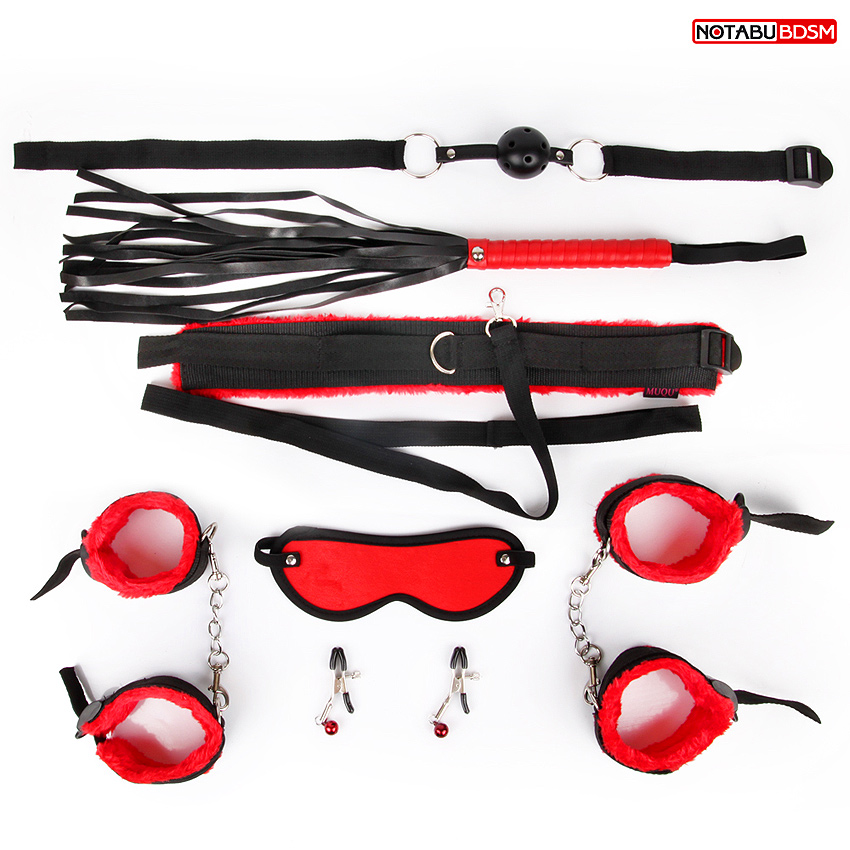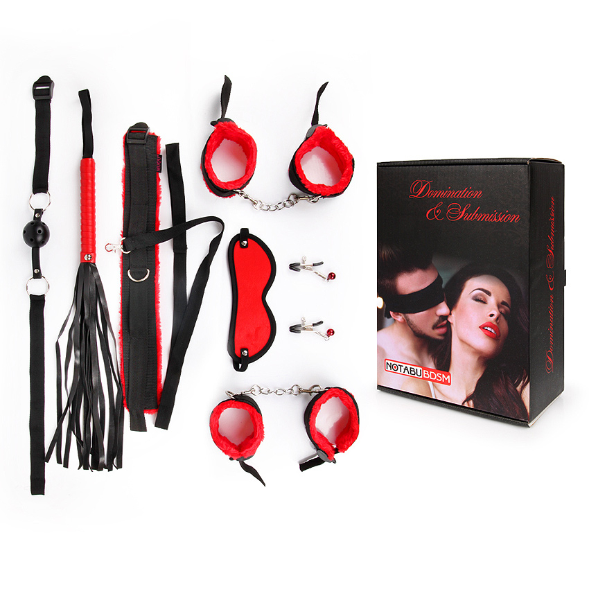 БДСМ набір Notabu (кляп ,наручники, кайдани, маска, нашийник з повідцем, батіг, затискачі для сосків) червоно-чорного кольору