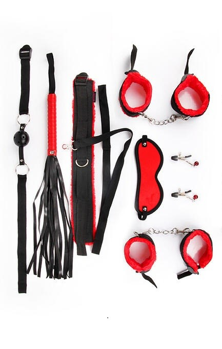 Чудовий набір аксесуарів для любителів БДСМ. У комплект входять наручники, кайдани, нашийник з ланцюжком-повідцем, фіксатор, батіг, кляп, маска.