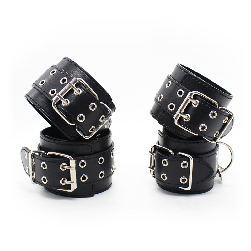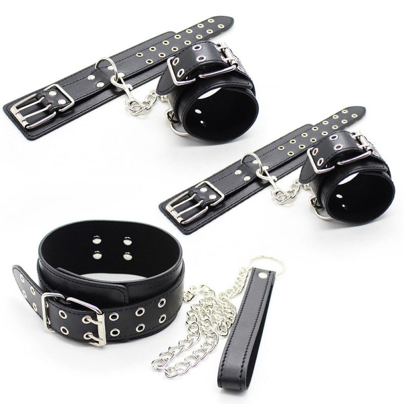 Набір з чорних наручників, наножників та нашийника з повідцем. Розмір регулюється.