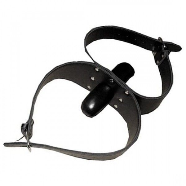 Чорний кляп для двох з натуральної шкіри, скріплений металевими заклепками. М'яка подушечка для рота. Регульовані ремені.