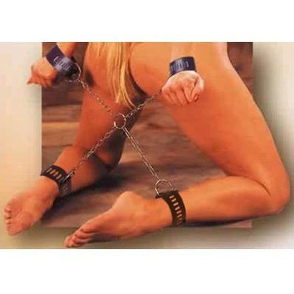 Чорний бондаж виготовлений з натуральної шкіри. Складається з наручників і наножников. Регульовані ремені забезпечують безпеку і комфорт. Міцні Ланцюги з нержавіючої сталі. У комплект входять 4 латунних замку і ключі.