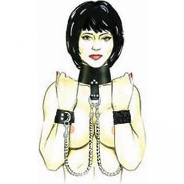 Чорний бондаж виготовлений з натуральної шкіри. Складається з наручників, нашийника і двох ланцюгів з нержавіючої сталі. Регульовані ремені забезпечують надійність і комфорт.