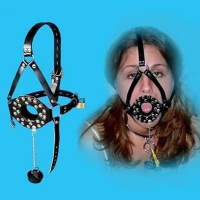 Сучасний чорний шкіряний намордник зі знімним металевим кляпом у формі кільця. Високоякісний матеріал. Регульовані ремені. Прикрашений металевими шипами і паєтками.