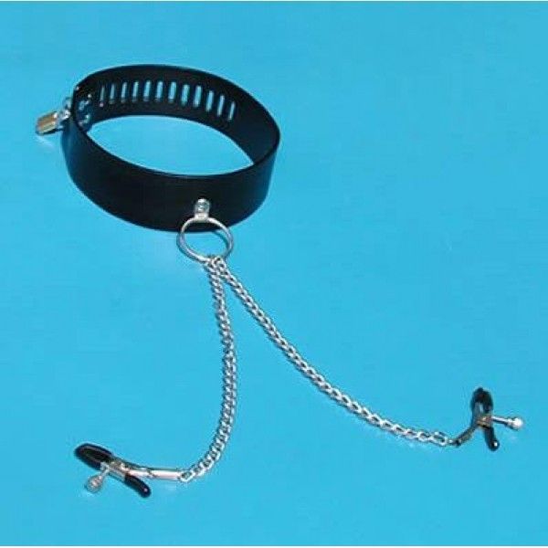 Чорний Шкіряний нашийник з тримачами для сосків. Довжина нашийника 42 см. охоплення шиї від 35 до 42 см.