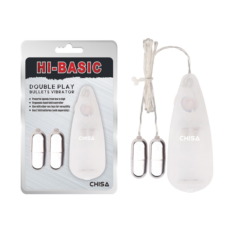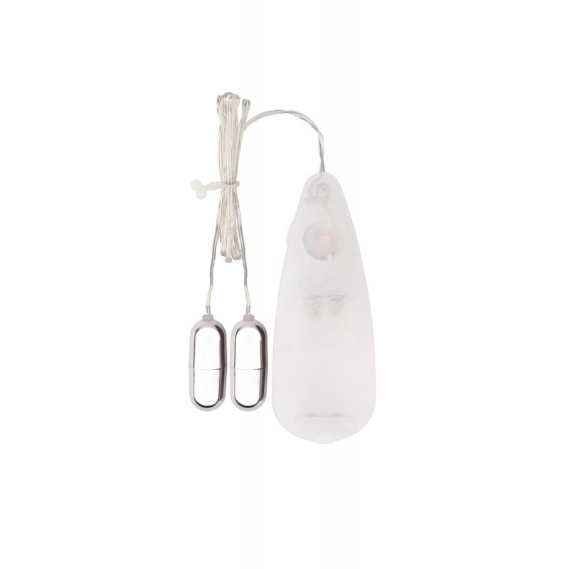 Дві вібропулі для стимуляції клітора сріблястого кольору з білим проводовим пультом ДК Chisa Double Play