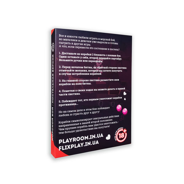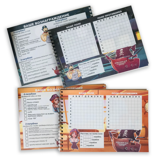 Перед початком битви за задоволення, виберіть, які "бонуси" ви отримаєте за потоплення ворожих кораблів. Список знаходиться на зворотному боці кожного листочка з полем бою. Важливо! Вам необхідно вибрати ті бажання, які виконає ваш "суперник" у разі своєї поразки (коли його кораблі будуть знищені). Кожен гравець сам вибирає, які призи він буде отримувати.
