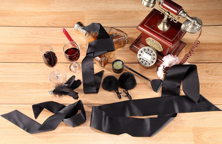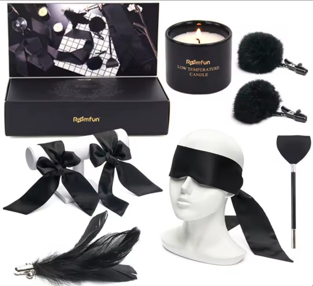 ов Набір, що підійде на подарунок або для романтичного вечора з другою половинкою. У ньому зібрані необхідні аксесуари для тих, хто починає пізнавати БДСМ або вже практикував подібні ігри. У набір входить пов'язка на очі з м'якого міцного атласу, а також пов'язки на руки для знерухомлення партнера. Невеликий стек для бавовни та лоскотання з м'якого пір'я щоб довести партнера до мурашок. Низькотемпературна ароматна свічка з феромонами для масажу або створення романтичної обстановки. Затискачі для сосків металеві з регулюванням сили затискання та м'якими чорними помпонами. Упаковка: коробка Пов'язка: атлас Наручники: атласні пов'язки Свічка: низькотемпературна, з феромонами Затискачі: метал, силіконові насадки, хутряні помпони Щокоталка: перо, метал Шльопалка: у вигляді стека, метал, шкірозамінник Колір: чорний.