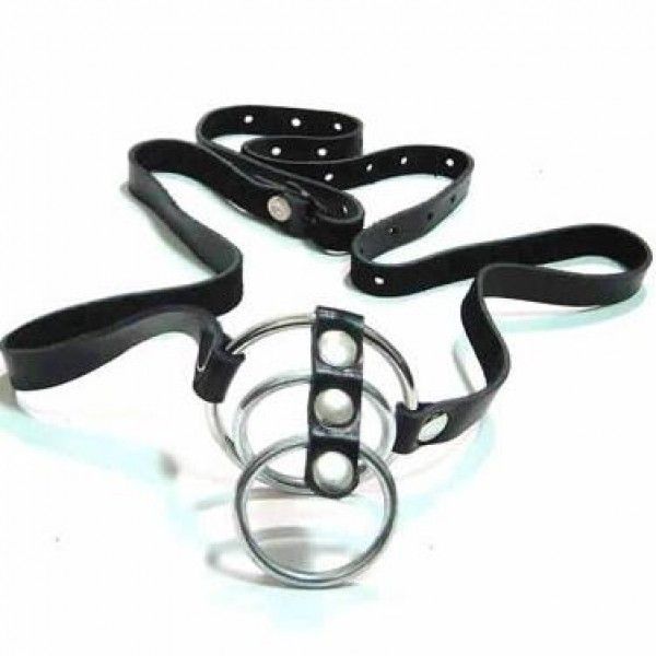 Чорний Шкіряний фіксатор на пеніс з трьома металевими кільцями. Регульовані ремені.