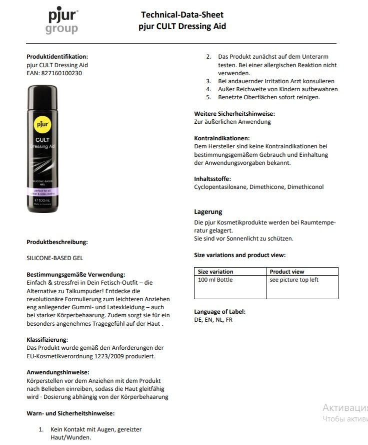 Даний препарат розроблений спеціально для любителів фетишу і допомагає легко надягати чарівні аксесуари з латексу, легко ковзаючи по його гладкій поверхні. Навіть якщо у вас багато волосся на тілі, Pjur Cult значно полегшить процес перевдягання у фетиш-аксесуари. Однак революційна формула препарату дбає не тільки про вашу зручність, а й про збереження, міцність та еластичність матеріалів.