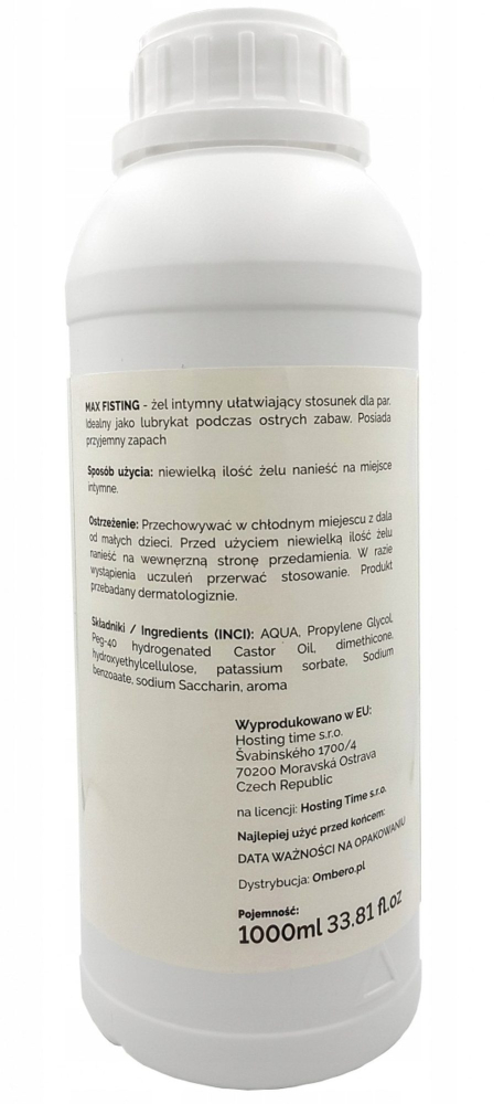 Гель MAX FISTING створює шовковистий, ніжний та неймовірно слизький шар, що забезпечує максимальний комфорт навіть під час найжорсткіших спроб фістингу. Це гель високої якості, призначений для найпотужніших фістингових ігор. Цей гель тримається рекордно довго і все завдяки спеціальній рецептурі. Уявіть себе фістингом, про який ви завжди мріяли, чи анальним сексом, про який ви ніколи раніше не мріяли. Гель створює ковзання та захисний шар від мікротравм та потертостей та допомагає отримувати від цього максимальне задоволення. MAX FISTING 1000 ml – це: Густий, реальний фістинговий гель. Ідеальний анальний гель для першої та початку цієї пригоди. Професійна якість. Розслаблення анальних м'язів. Незвичайне зволоження. Оптимальне ковзання. Безпечний фістинг та анал без садна та тріщин на шкірі. Інгредієнти: AQUA, Propylene Glycol, Peg-40 hydrogenated Castor Oil, dimethicone, hydroxyethylcellulose, patassium sorbate, Sodium benzoaate, sodium Saccharin, aroma. Ідеально підходить для першої анальної гри, де ковзання, розслаблення та безпека є найважливішими, адже від них залежить задоволення від цього виду проникнення. Для всіх видів анальних гаджетів як великих, так і маленьких. Незрівнянний у вправах на анальну розтяжку. Ідеально підходить для тих, хто хоче відчути задоволення від безпечної анальної гри. Для людей, які цінують комфорт та безпеку за розумною ціною. Спосіб застосування: Візьміть невелику кількість гелю та нанесіть його на інтимні місця. Розповсюдження. Не чекайте на вбирання. Місткість: 1000 мл