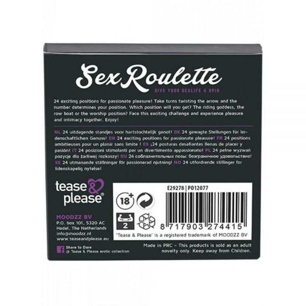 Принесіть пристрасті і вогню в своє сексуальне життя! Sex Roulette-відмінна гра від Tease and Please. Випробуйте найсильніші емоції у своєму особистому житті, просто повернувши стрілу на дошці. Стрілка вказує на число, під яким в книжечці вас чекає еротичний виклик. 24 випробування видання Love & Marriage доступні на 10 мовах: англійській, іспанській, французькій, німецькій, голландській, польській, російській, італійській, шведській та норвезькій, і додадуть захоплюючий поворот у ваше сексуальне життя ще більшу пристрасть і задоволення. Може бути, ви навчилися новим трюкам і позиціям? Випробуйте свою любов і еротичні моменти разом.