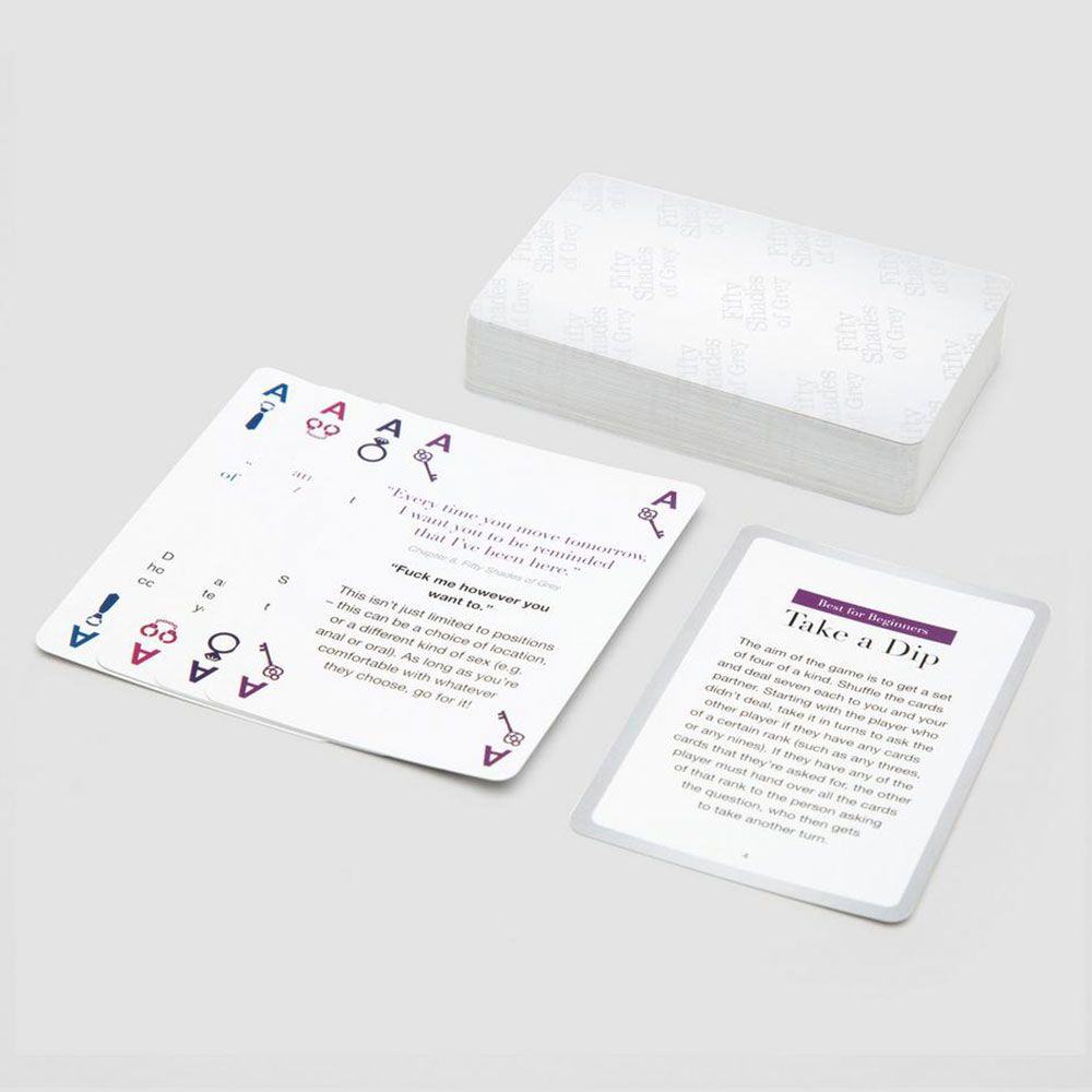Розроблена як стандартна колода, складається з 52 карт та чотирьох класичних мастей Fifty Shades: Ключ, Краватка, Манжети та Кільце. Але це набагато більше, ніж ваші звичайні гральні карти – на кожній є смілива фраза, яка допоможе вам опанувати мистецтво брудних розмов.