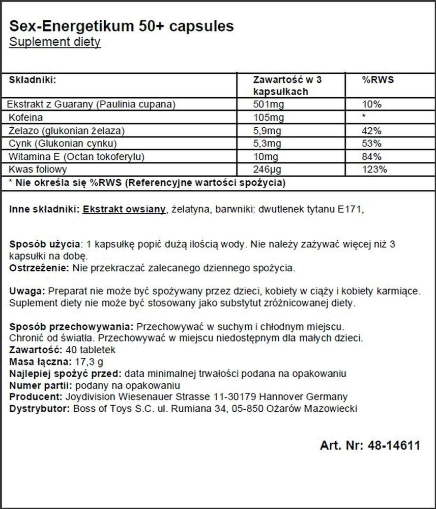 Капсули EROpharm - Sex Energetikum 50+ 40 капсул Секс-Енергетикум - харчова добавка в капсулах для отримання повноцінної та здорової сексуальності. Ця суміш вітамінів і мінералів підвищить вашу сексуальну активність і рекомендується як чоловікам, так і жінкам, особливо старше 50 років.