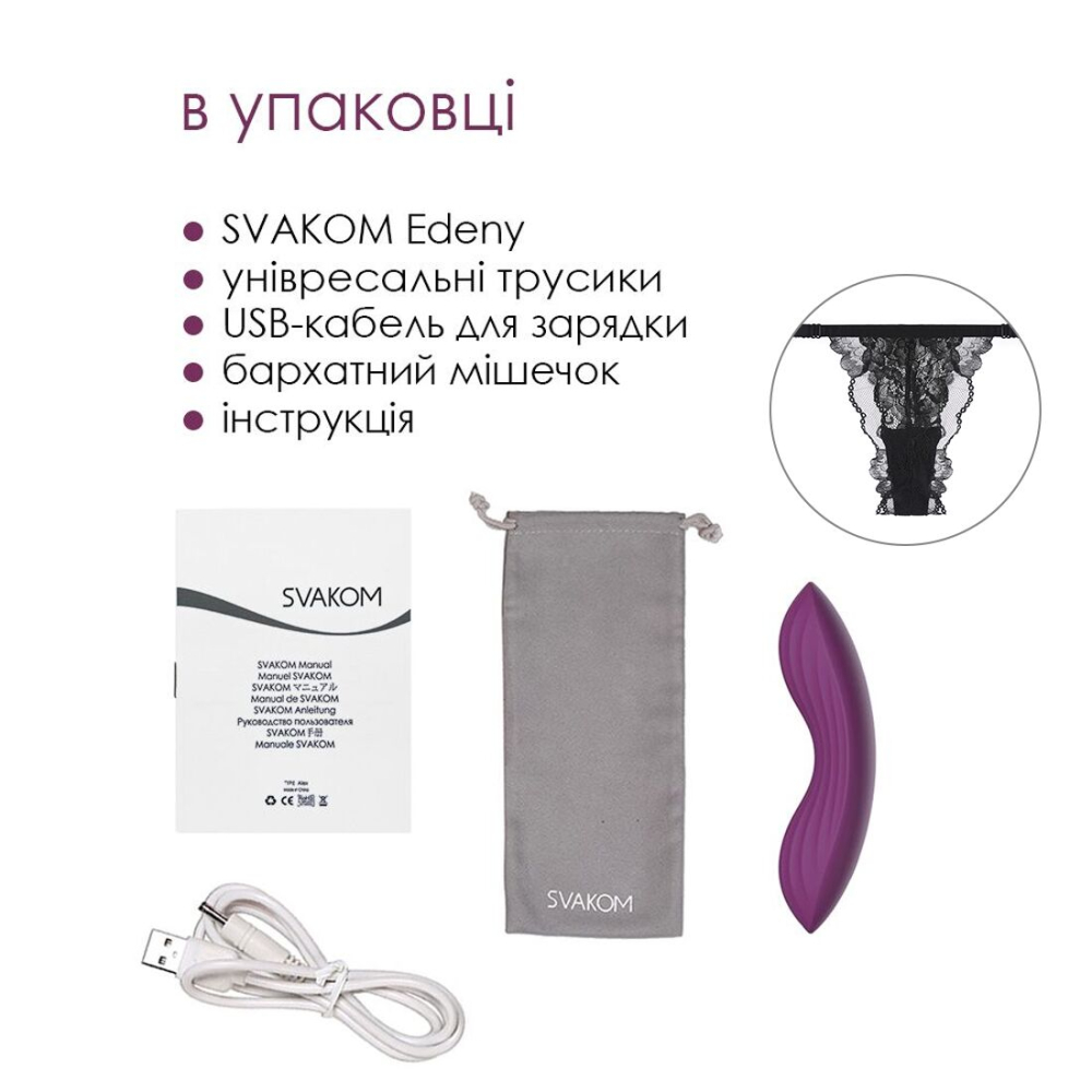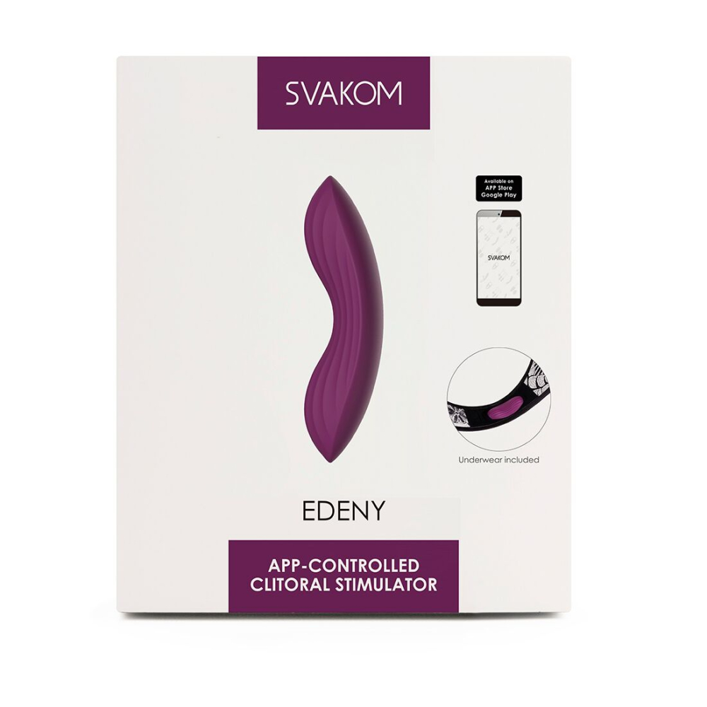 Справжній витвір мистецтва, яке приносить не тільки естетичну насолоду, а й цілком фізичне, причому — фантастичне! Пропонуємо купити смарт-вібратор в трусики Svakom Edeny: унікальну знахідку розробників Сваком, що поєднує нові технології і анатомічно вірний дизайн. Він буде вібрувати в твоїх трусиках в 11 режимах, зводячи тебе з розуму з кожним кроком, з кожним музичним ритмом і кожним свайпом по смартфону. Легко управляється через додаток і синхронізується з інтерактивною веб камерою для захоплюючих перформансів! Мереживні трусики в комплекті.