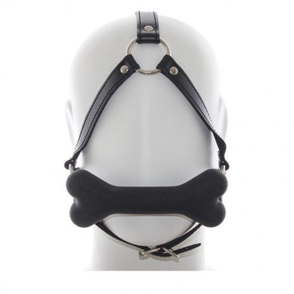 Чорний кжаний кляп для рота з м'якою силіконовою подушечкою-кісточкою. Міцний регульований ремінь і замочок для запобігання.