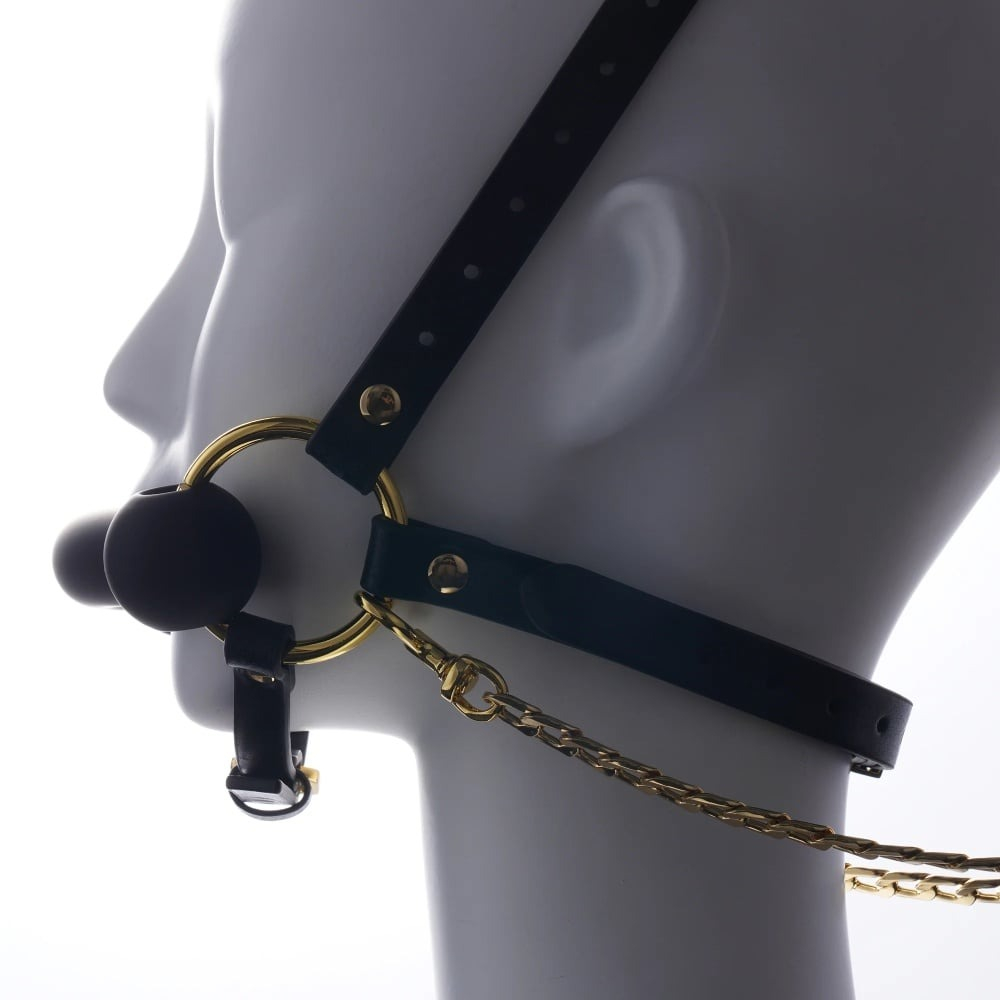 Кляп кісточка в рот БДСМ з портупеєю на голову та повідцем ланцюжком чорного кольору UPKO