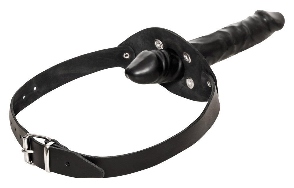Кляп від ZADO з регульованим чорним шкіряним ремінцем на голову та зовнішнім фалоімітатором, що знімається (на кнопках). Фалоімітатор та кляп виготовлені з латексу та мають форму пеніса з виразною головкою.