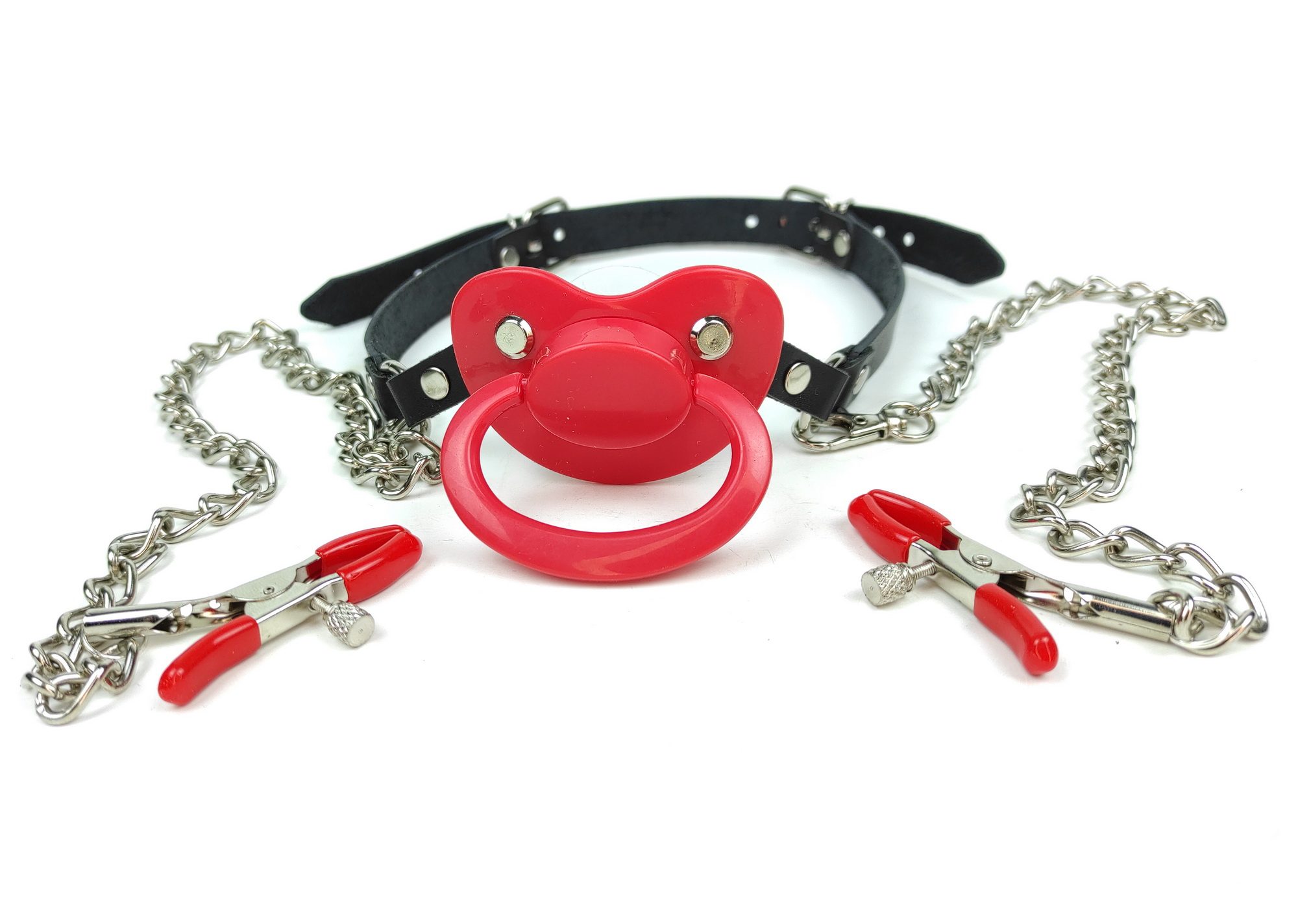 Набір Кляп “Соска з затискачами”Колір : чорний, червонийМатеріал: натуральна шкіраРозмір -регулюється