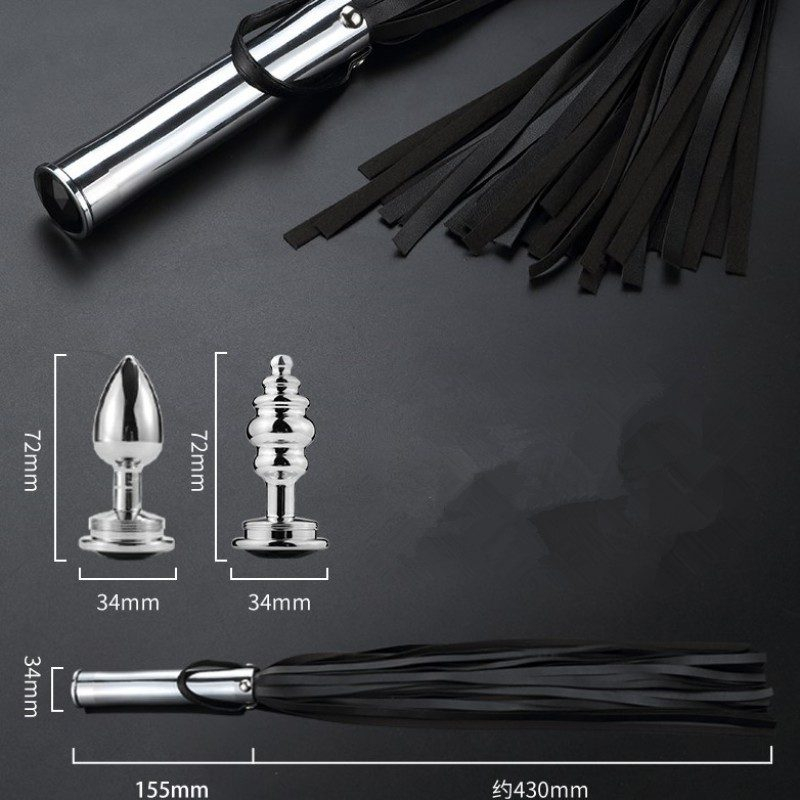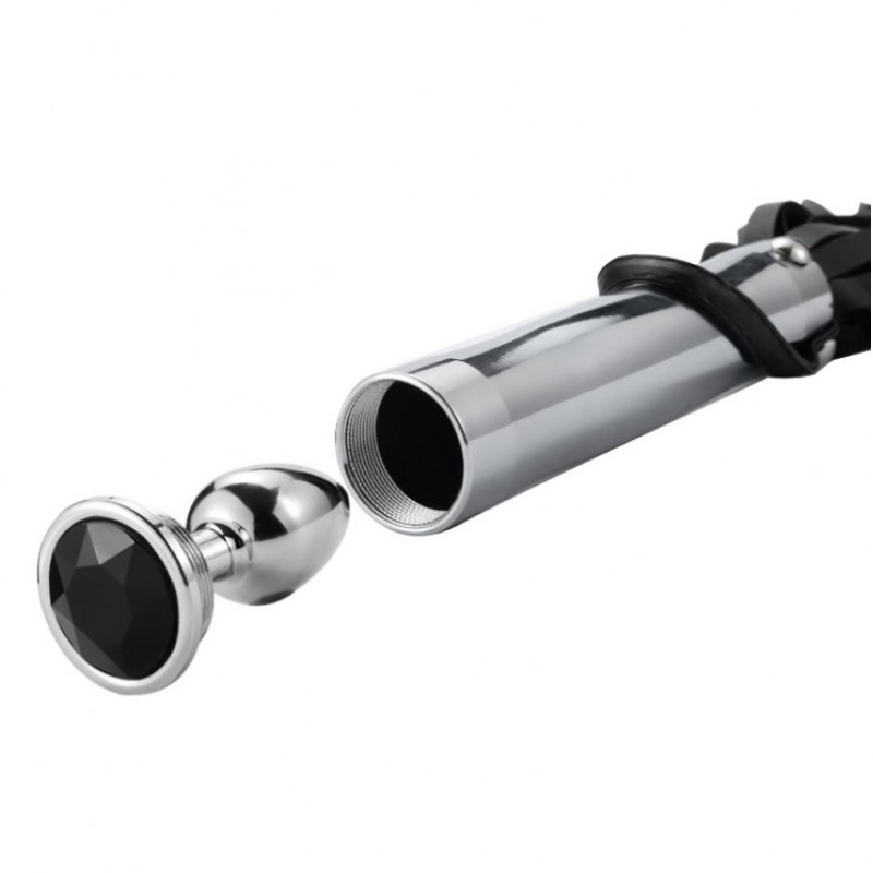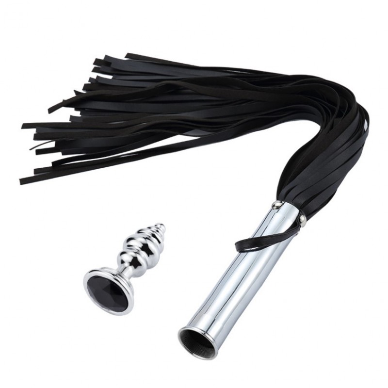 Характеристики Комплект анальний металевий затор сріблястого кольору з камінчиком чорного кольору з'єднаний з батогом Bdsm4u Anal Plug Combination