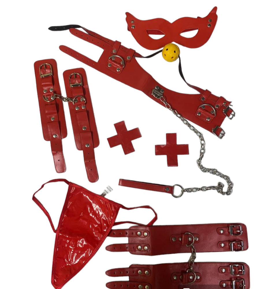 Комплект 6 предметів (наручники + маска + пестиси + ошейник з кляпом + труси + поножі) Sunspice