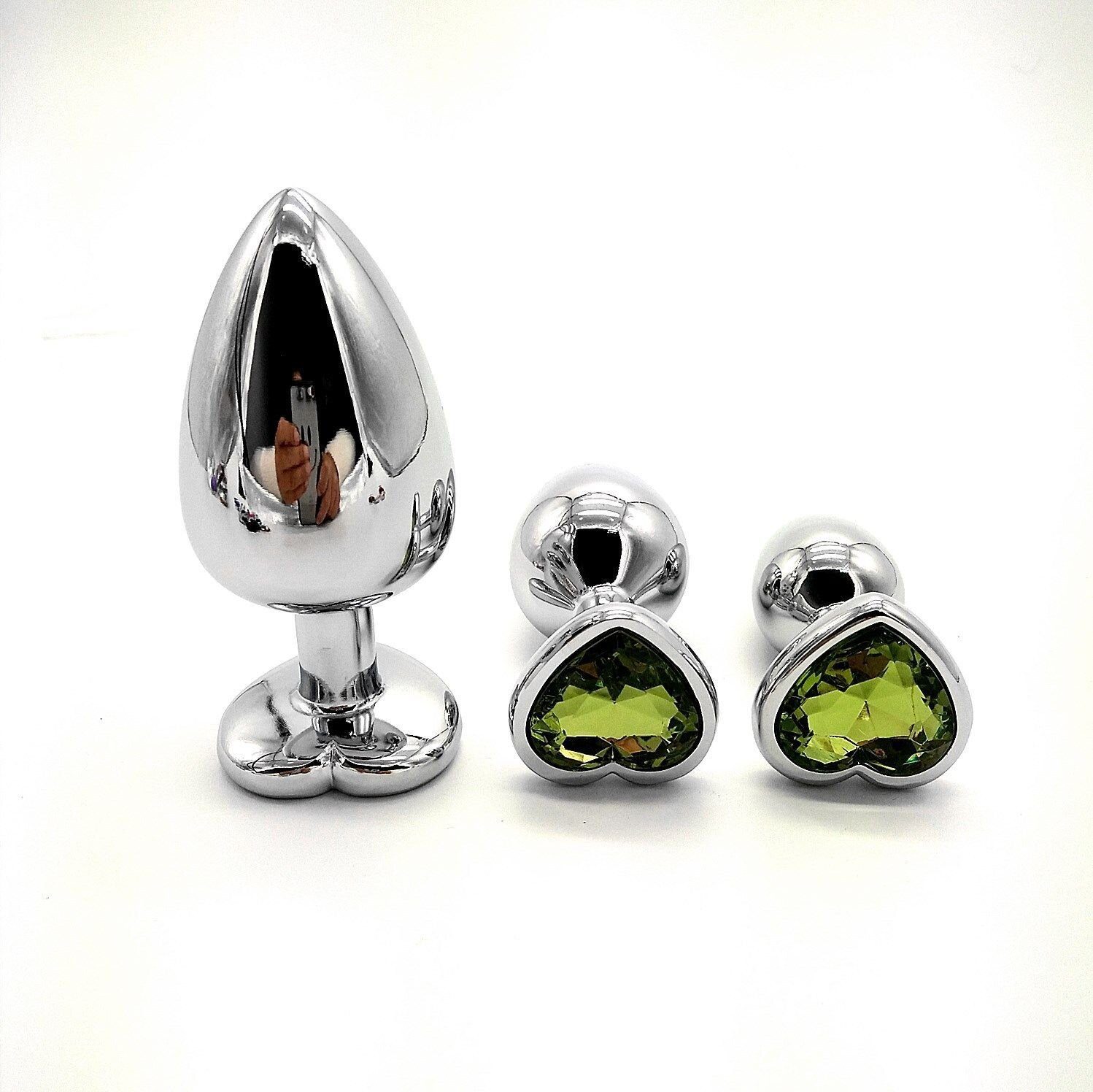 Характеристики Комплект сріблястих анальних пробок у формі серця з салатовим кристалом SKN-NMS12 розмір S, M, L