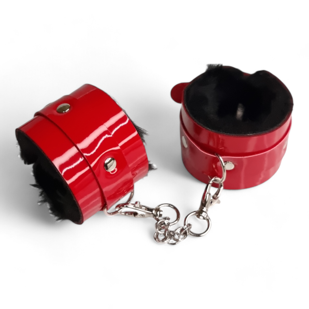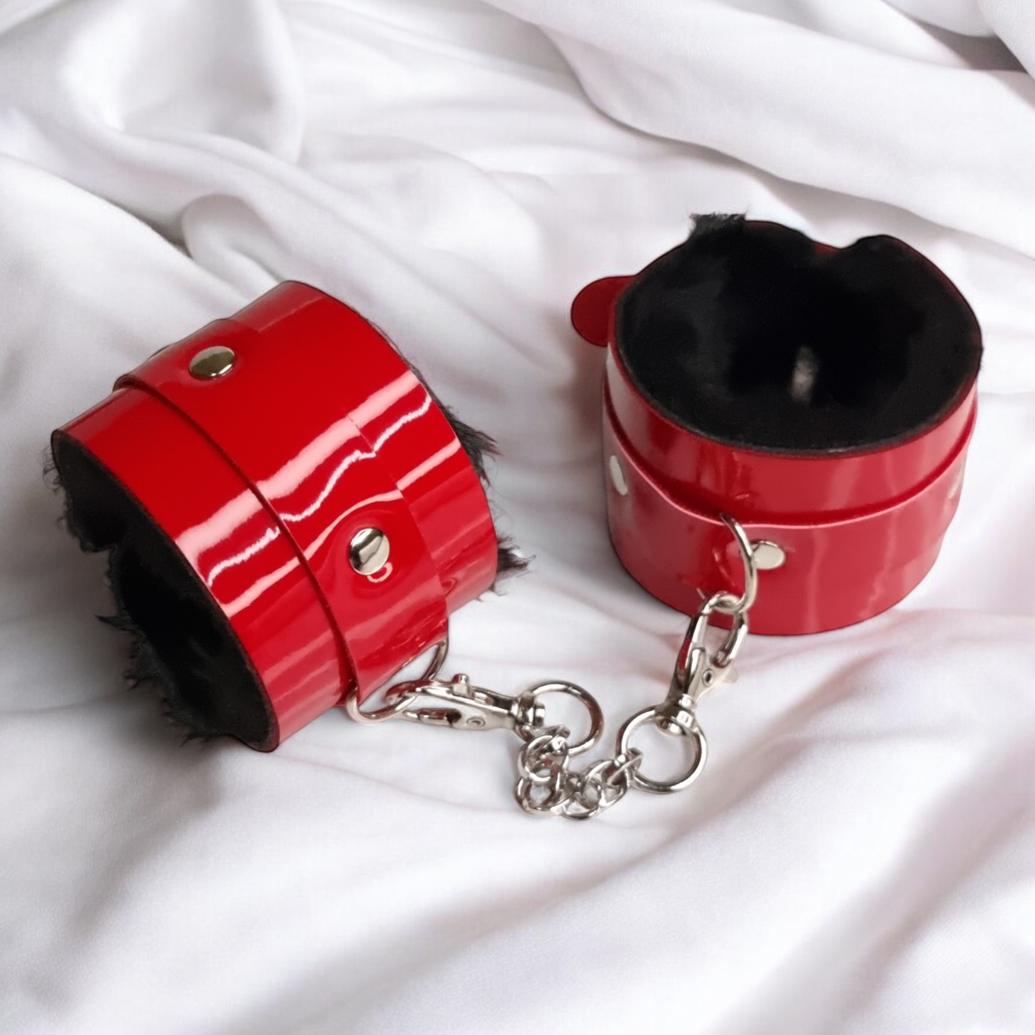 Спробуйте закувати вашу другу половинку у надійні лакові наручники. Незамінна річ для любителів жорстких еротичних ігор! Надійно прив'язавши вашу видобуток ви сміливо зможете катувати її всіма різними і доступними для вас способами. Кожен аксесуар виготовлений з еко-шкіри тонкого вироблення неймовірного червоного відтінку з хутром і прикрашений металевими аксесуарами срібла. Тримайте партнера повністю зафіксованим у цих кайданках! Ці манжети, з'єднані швидкороз'ємним затискачем, можна прикріпити до інших ременів безпеки або будь-якого обладнання, яке у вас є. Міцні, але гладкі, з м'яким хутром усередині. Головне вміти вчасно зупинитися і не переступити межу дозволеного і розпусного світу сексу та кохання!!