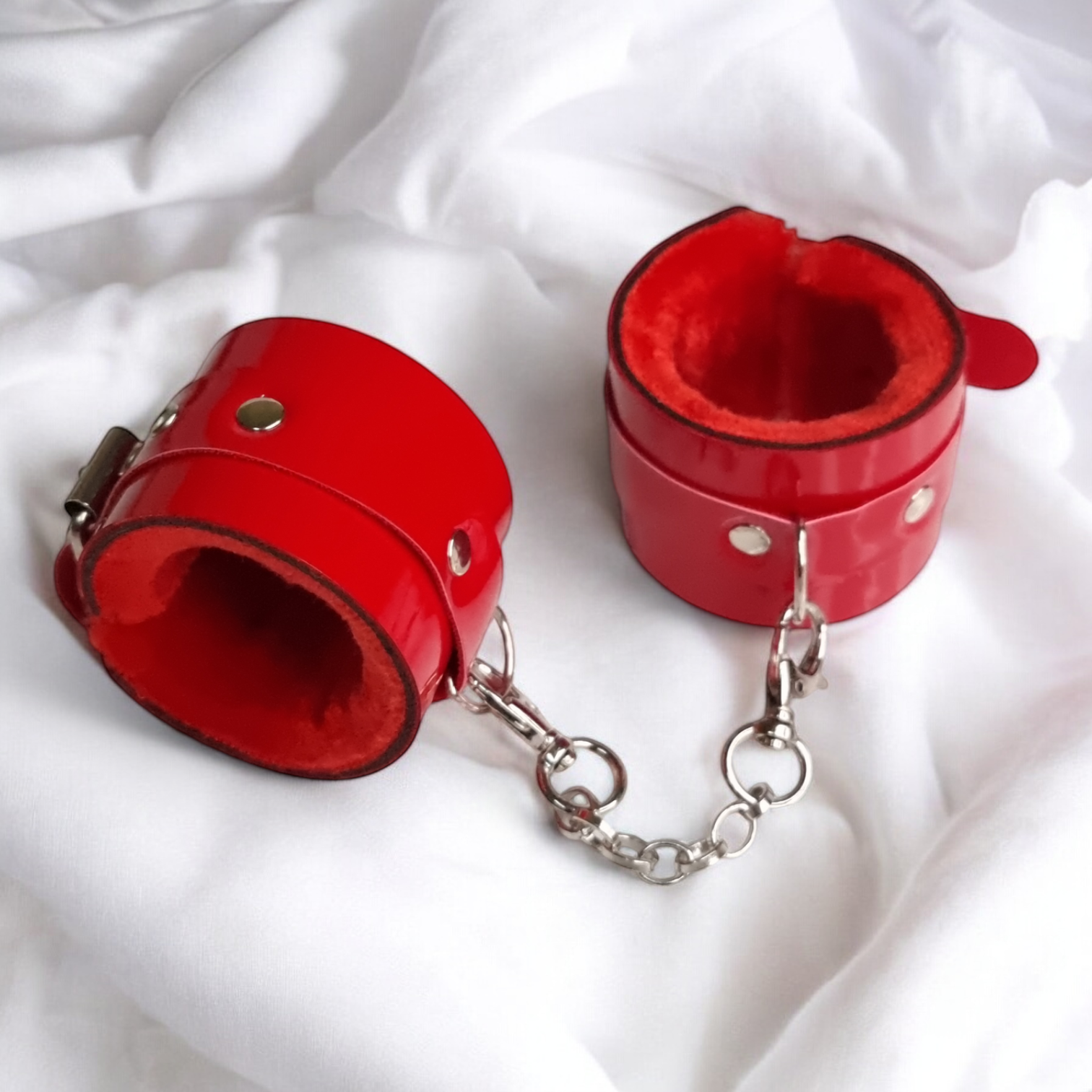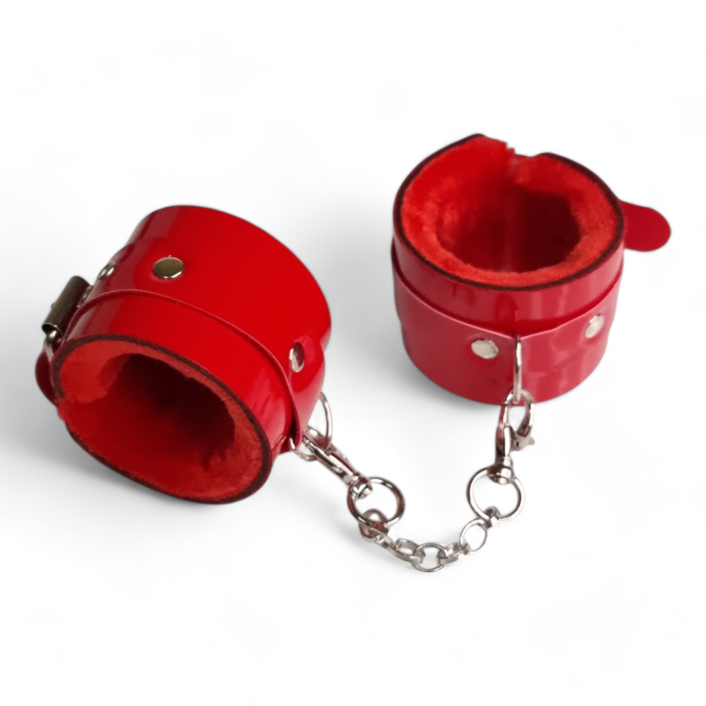 Спробуйте закувати вашу другу половинку у надійні лакові наручники. Незамінна річ для любителів жорстких еротичних ігор! Надійно прив'язавши вашу видобуток ви сміливо зможете катувати її всіма різними і доступними для вас способами. Кожен аксесуар виготовлений з еко-шкіри тонкого вироблення неймовірного червоного відтінку з хутром і прикрашений металевими аксесуарами срібла. Тримайте партнера повністю зафіксованим у цих кайданках! Ці манжети, з'єднані швидкороз'ємним затискачем, можна прикріпити до інших ременів безпеки або будь-якого обладнання, яке у вас є. Міцні, але гладкі, з м'яким хутром усередині. Головне вміти вчасно зупинитися і не переступити межу дозволеного і розпусного світу сексу та кохання!!